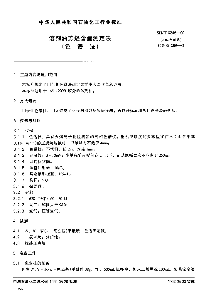 SH/T 0245-1992 溶剂油芳烃含量测定法(色谱法)