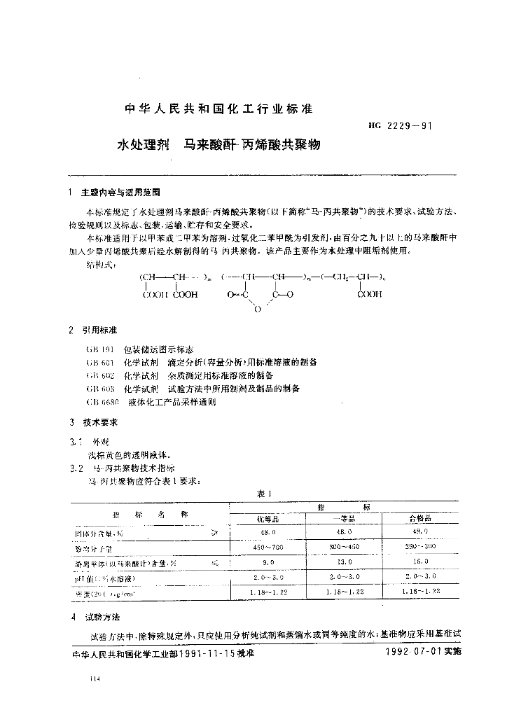 HG 2229-1991 水处理剂 马来酸酐-丙烯酸共聚物