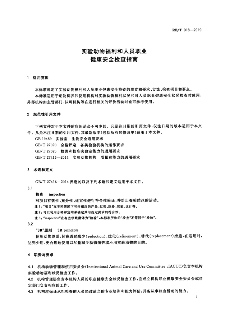 RB/T 018-2019 实验动物福利和人员职业健康安全检查指南