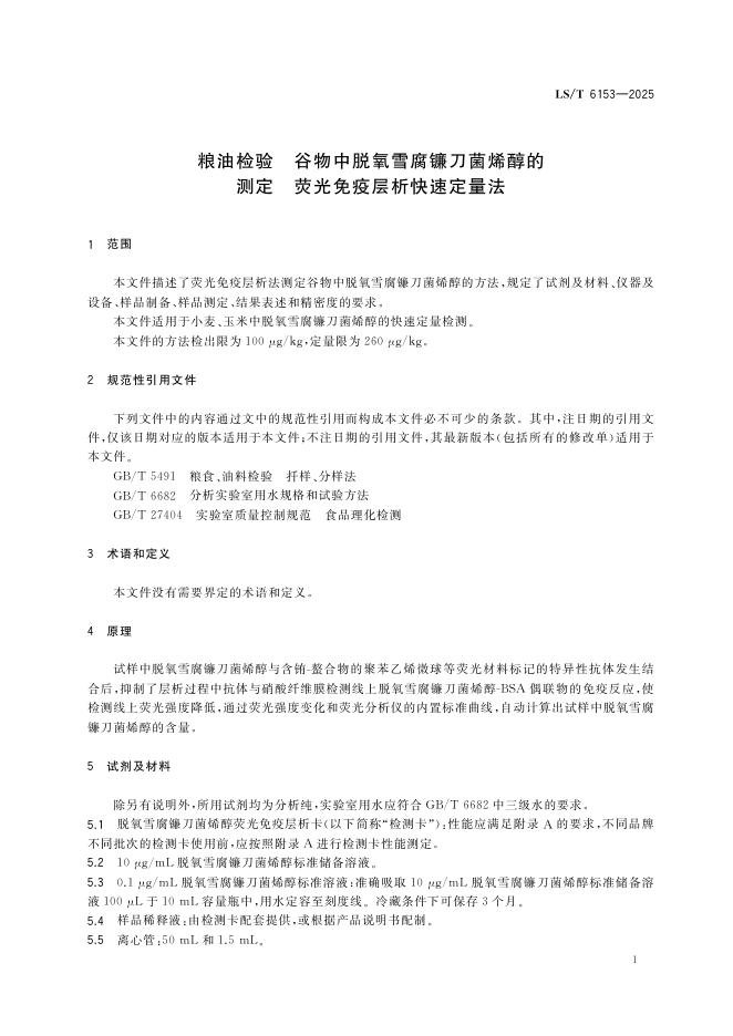 LS/T 6153-2025 粮油检验 谷物中脱氧雪腐镰刀菌烯醇的测定 荧光免疫层析快速定量法