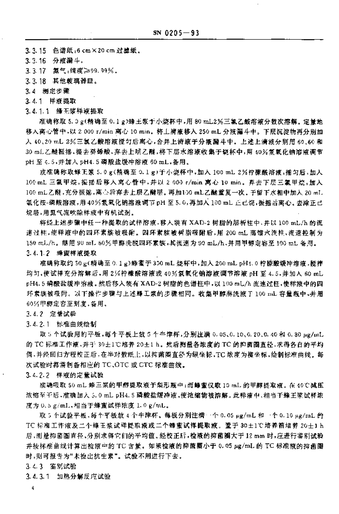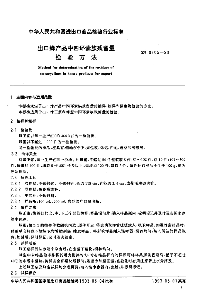 SN 0205-1993 出口蜂产品中四环素族残留量检验方法