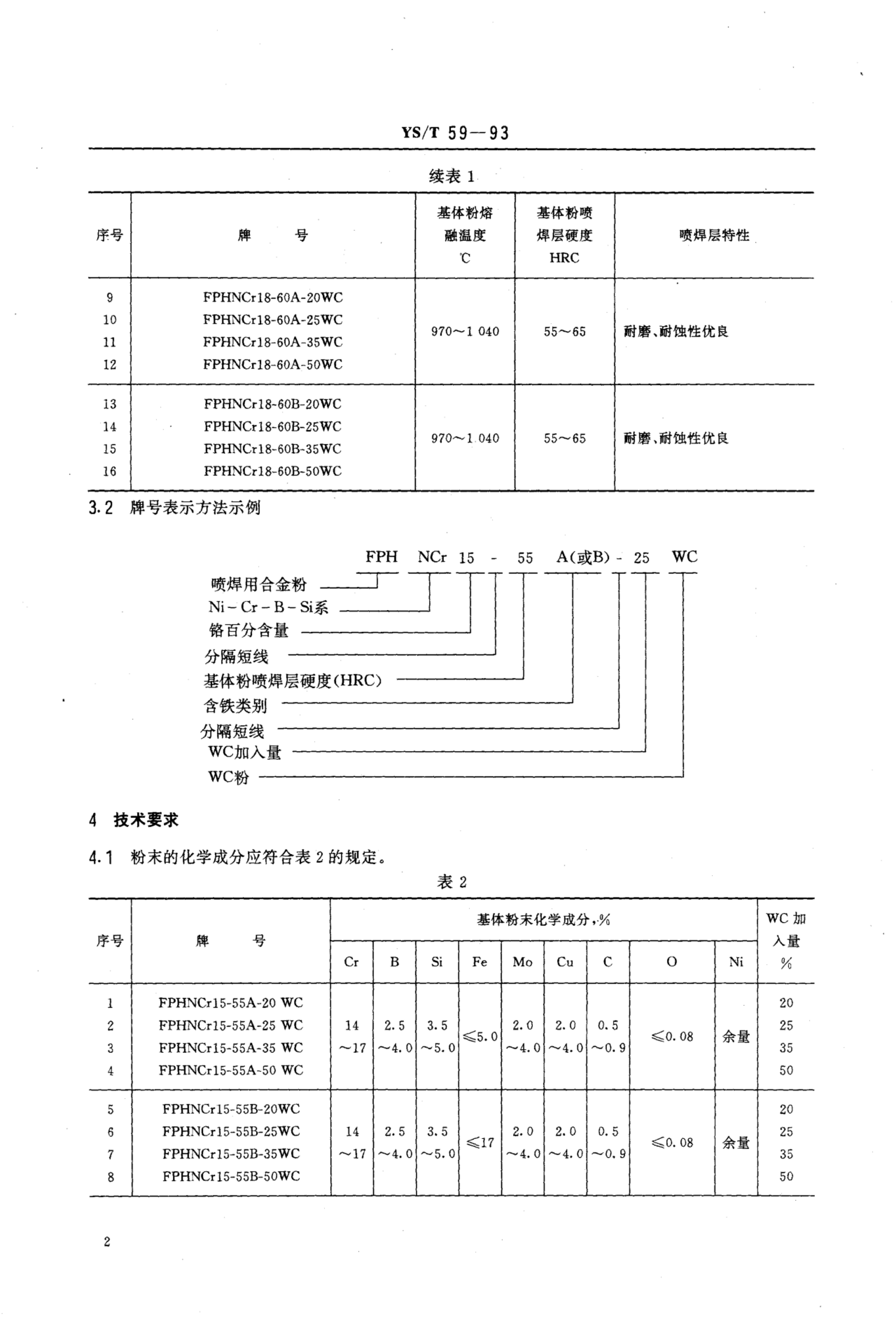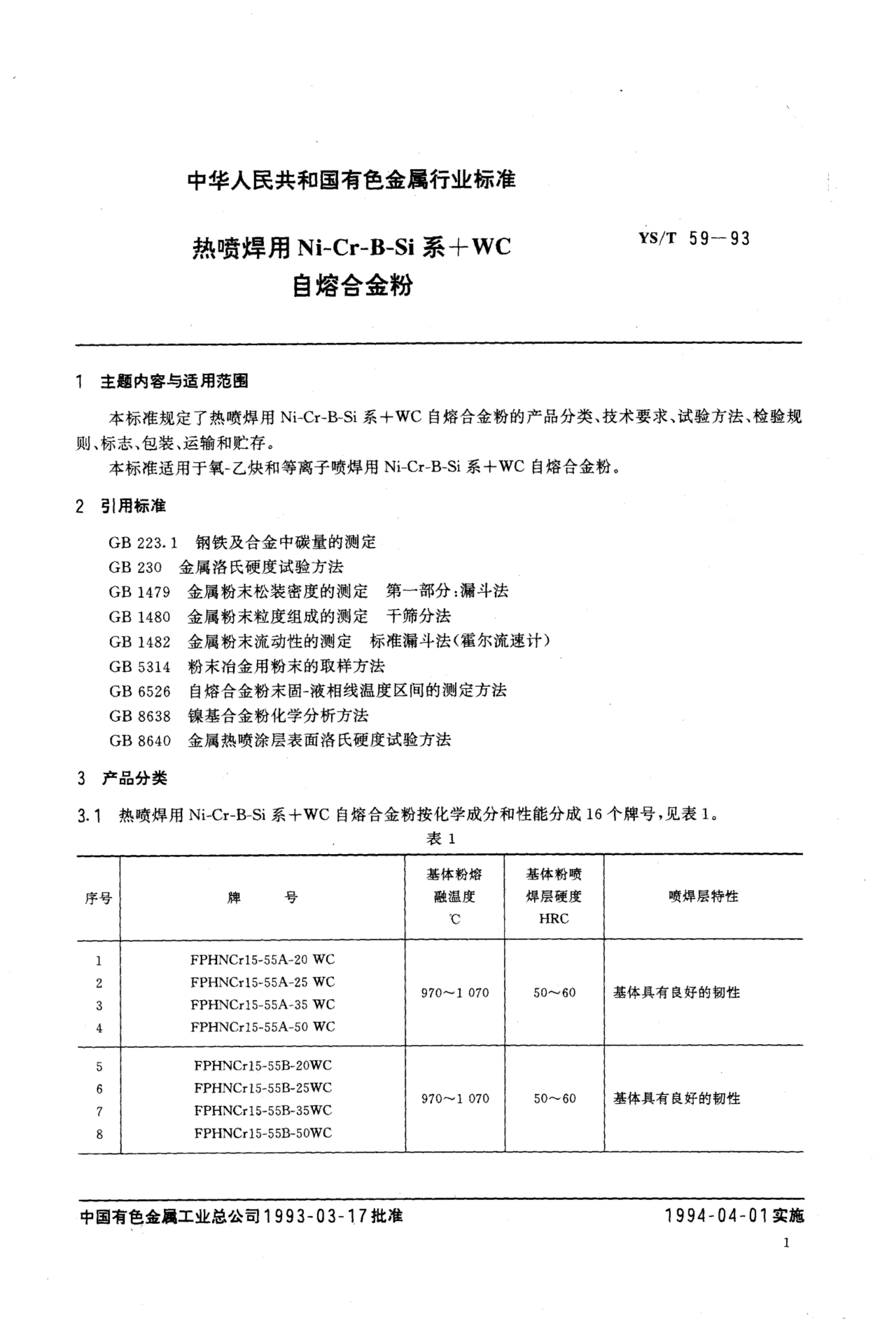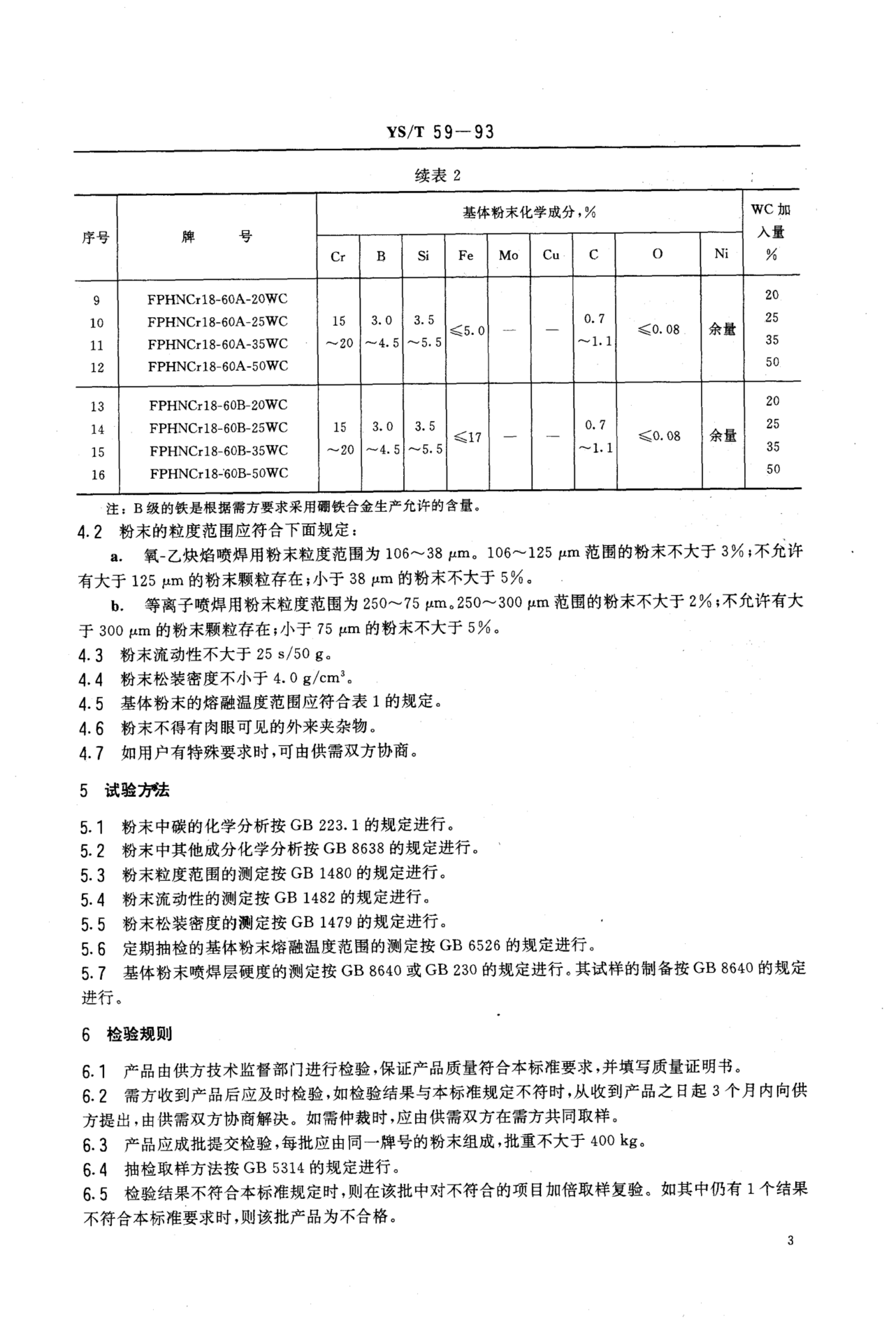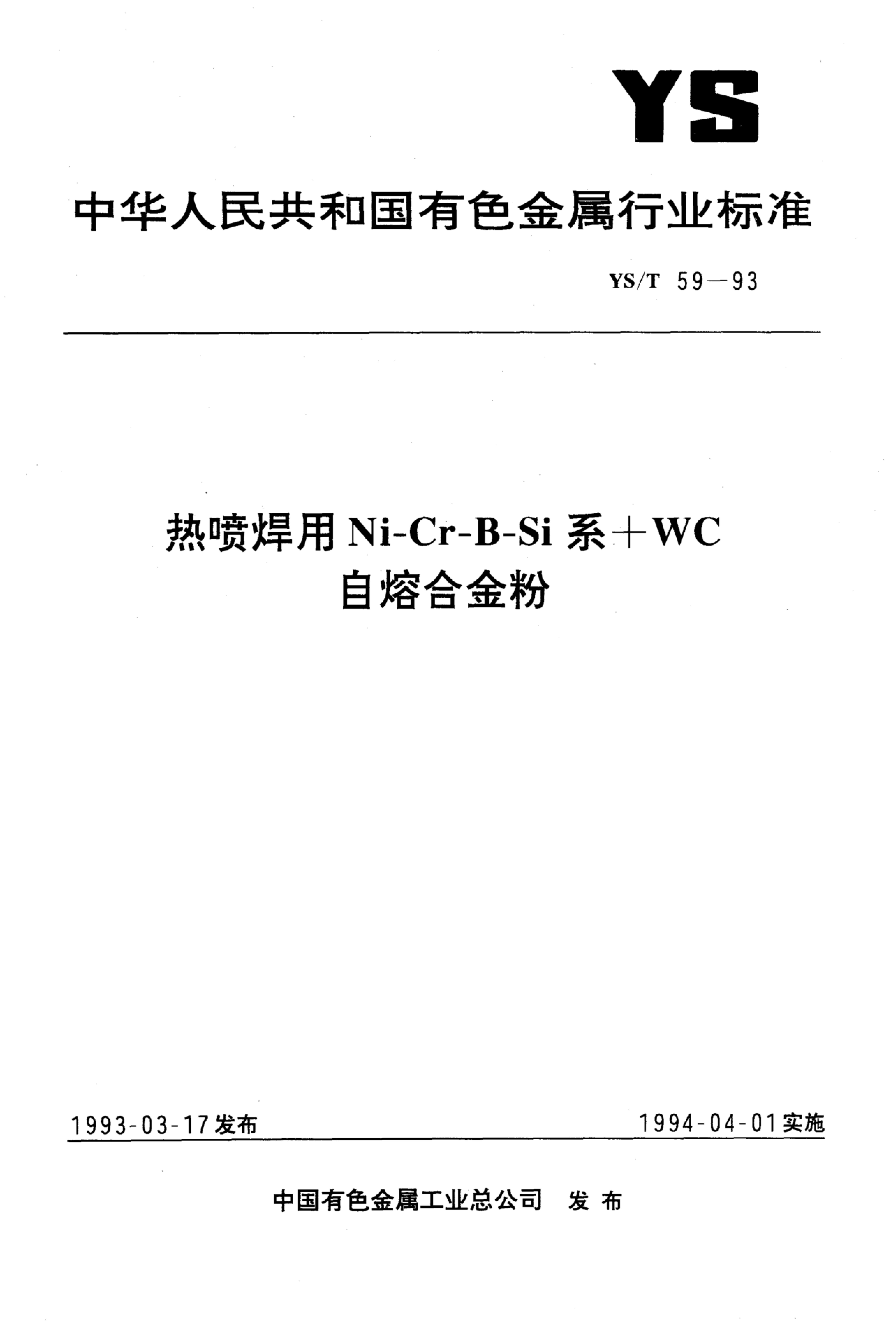 YS/T 59-1993 热喷焊用Ni-Cr-B-Si系+WC自熔合金粉