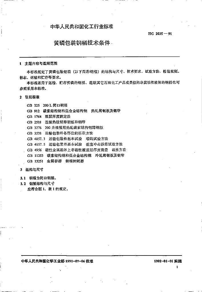 HG 2035-1991 黄磷包装钢桶技术条件