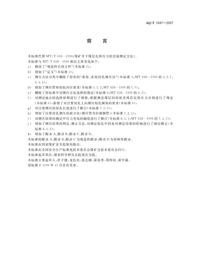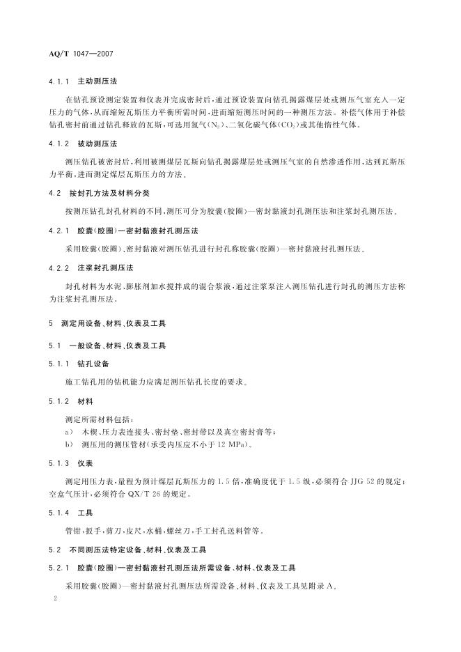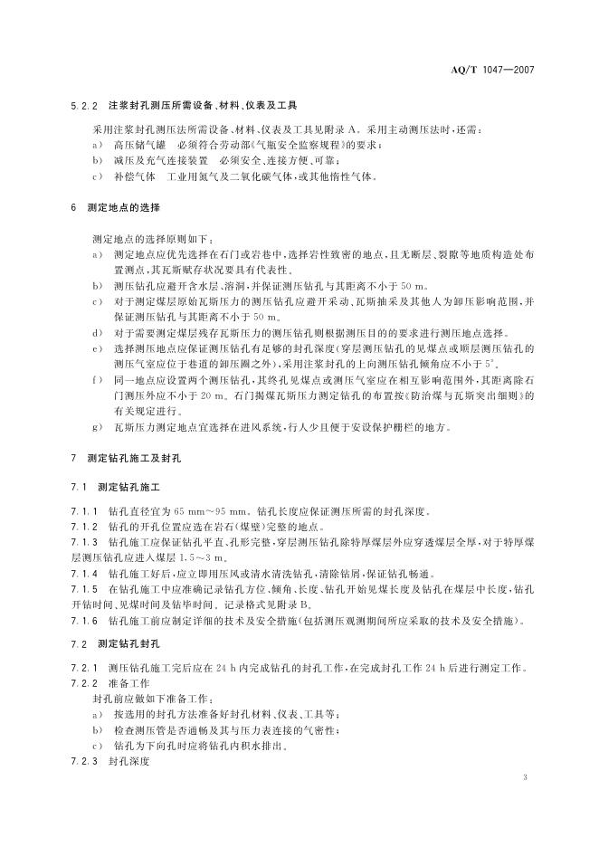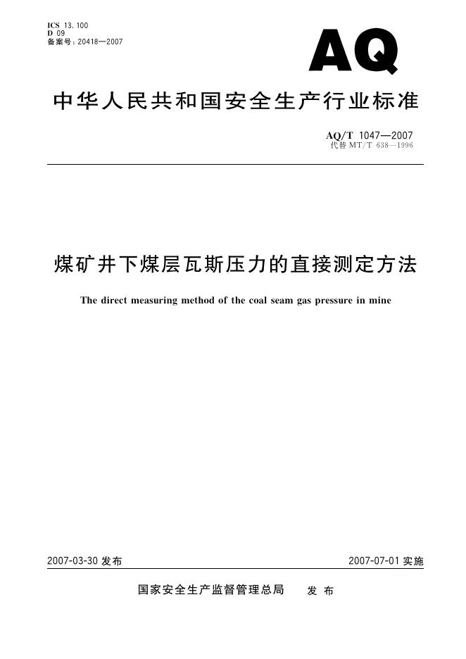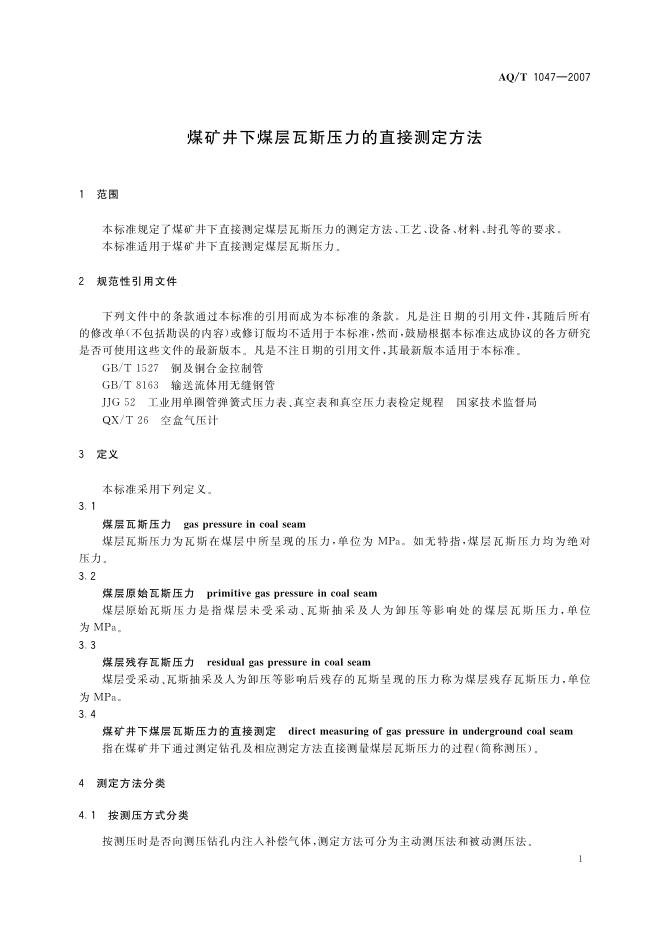 AQ 1047-2007 煤矿井下煤层瓦斯压力的直接测定方法