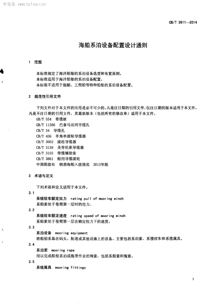 CB/T 3911-2014 海船系泊设备配置设计通则
