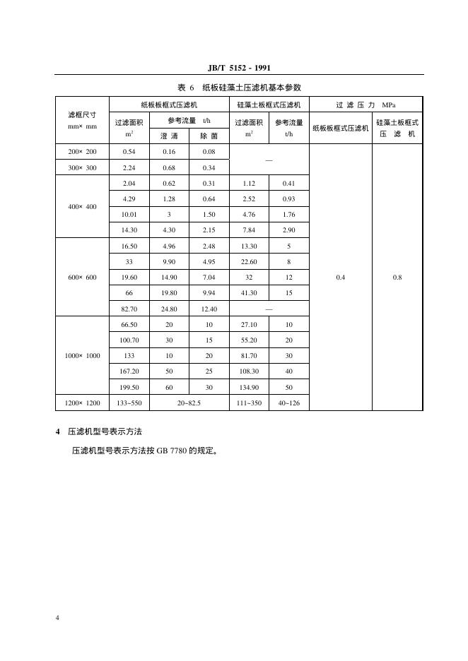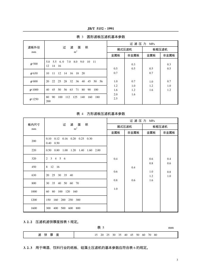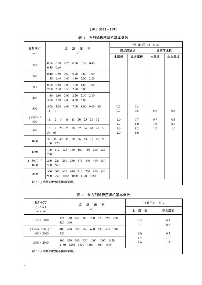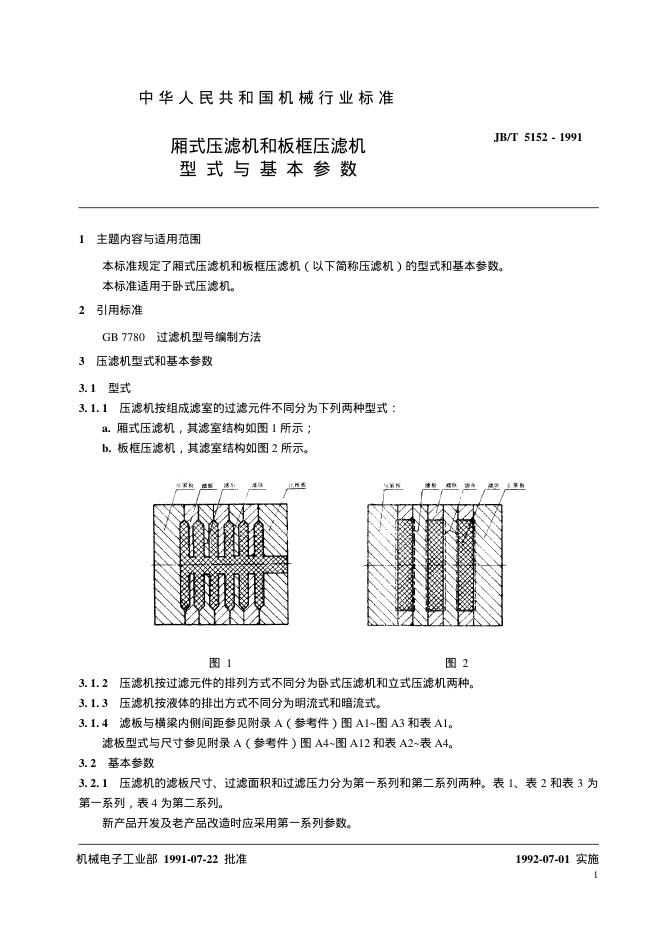 JB/T 5152-1991 厢式压滤机和板框压滤机 型式和基本参数
