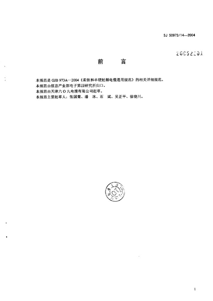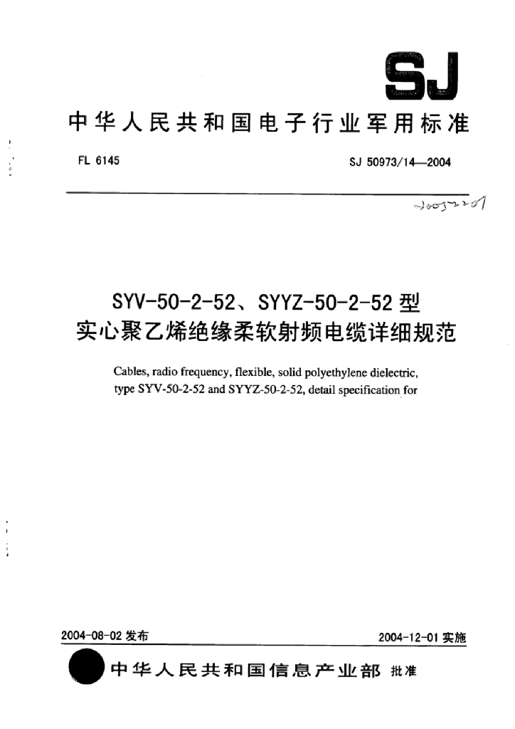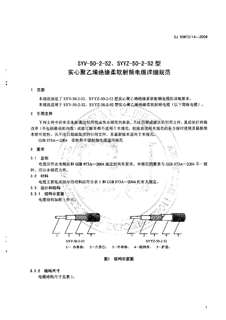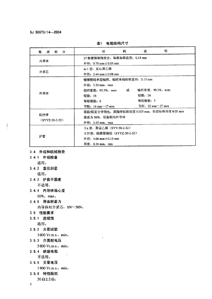 SJ 50973/14-2004 SYV-50-2-52、SYYZ-50-2-52 型实心聚乙烯绝缘柔软射频电缆详细规范