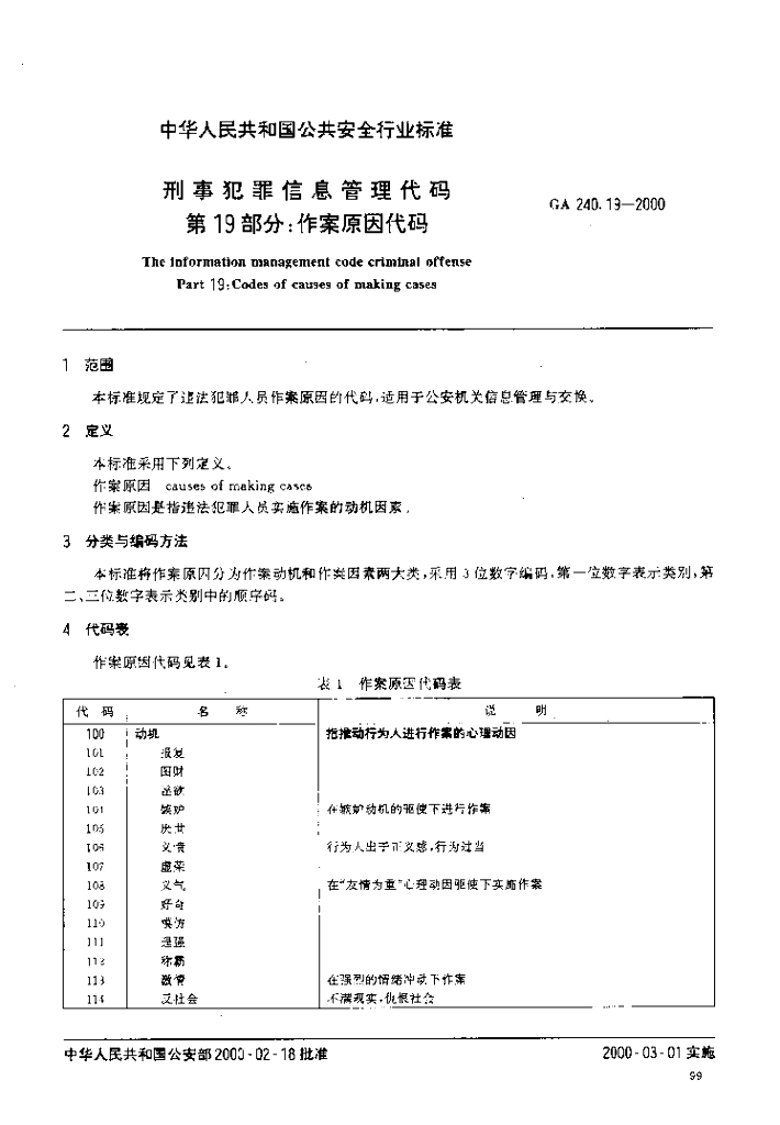 GA 240.19-2000 刑事犯罪信息管理代码 第19部分:作案原因代码
