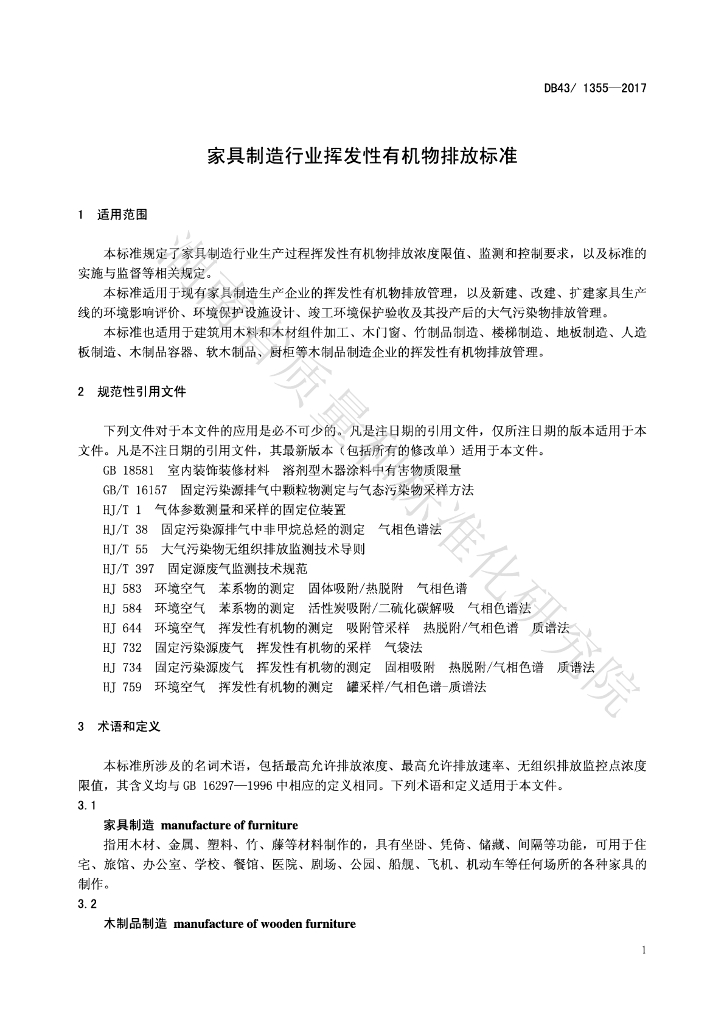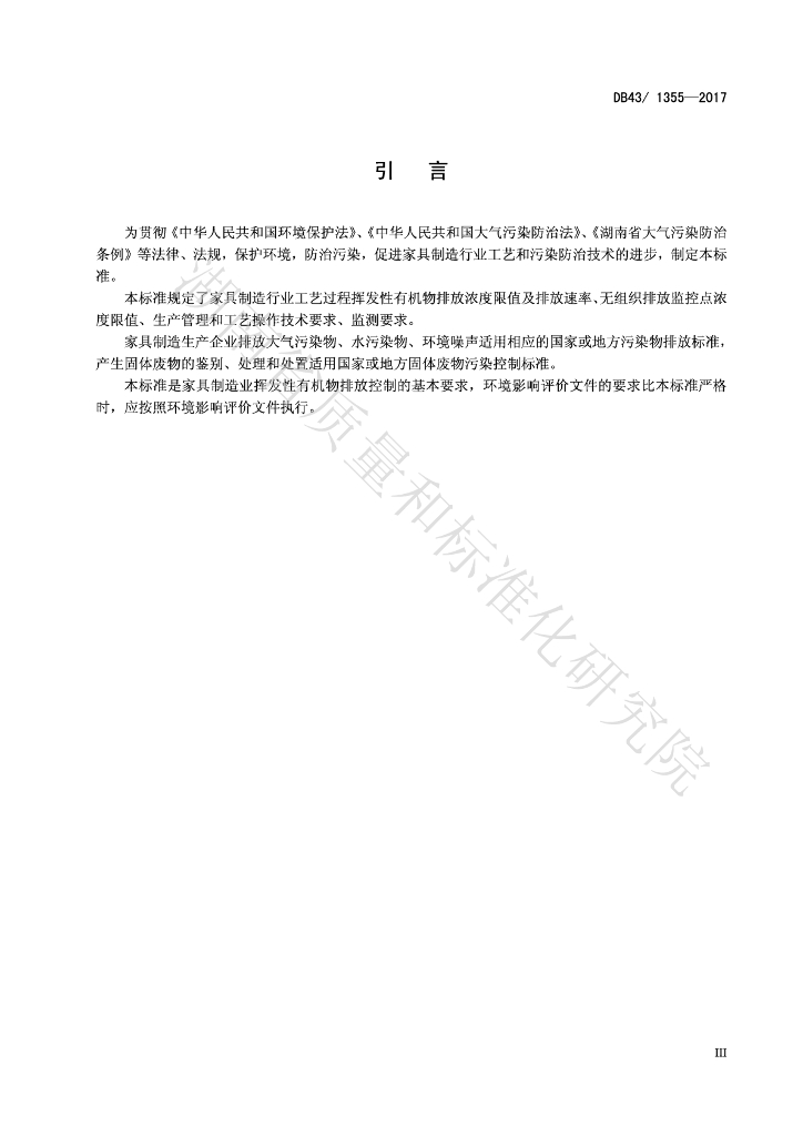 DB43/ 1355-2017 湖南省家具制造行业挥发性有机物排放标准