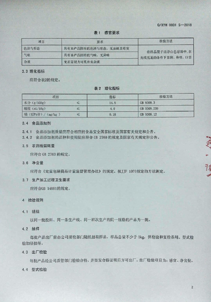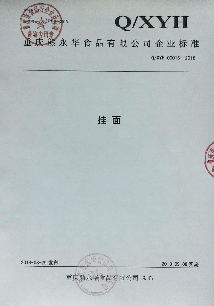 Q/XYH 0001S-2018 挂面