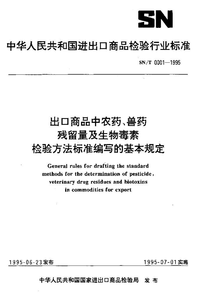 SN/T 0001-1995 出口商品中农药、兽药残留量及生物毒素检验方法标准编写的基本规定