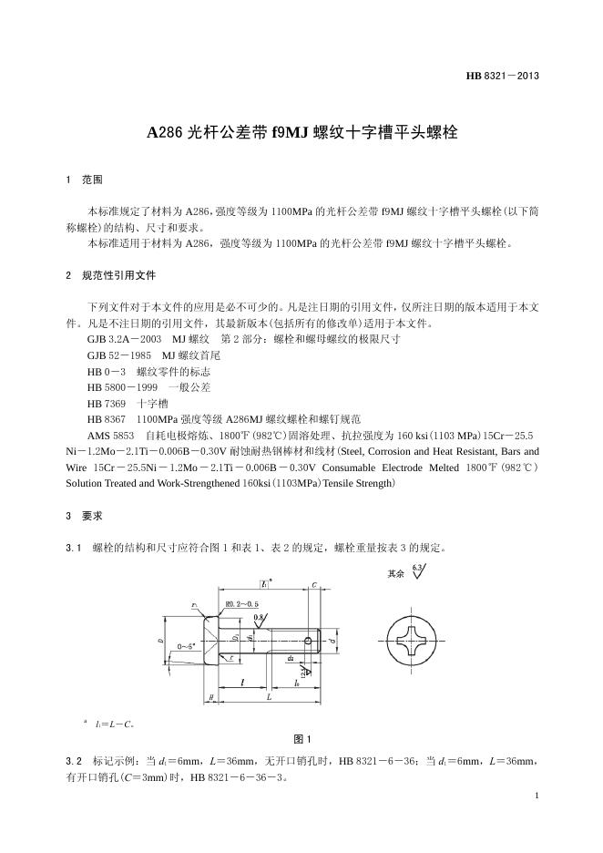 HB 8321-2013(2017) A286光杆公差带F9MJ螺纹十字槽平头螺栓