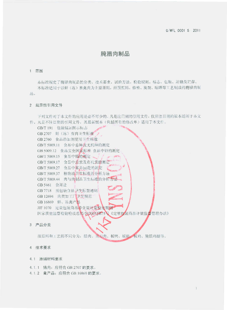 Q/WFL 0001S-2011 腌腊肉制品