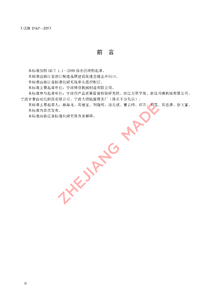 本标准由浙江省标准化研究院牵头组织制订。、本标准主要起草单位:宁波博信机械制造有限公司。、本标准参与起草单位:宁波市产品质量监督检验研究院、浙江万里学院、浙江玛德机械有限公司、宁波宇泰自动化科技有限公司、宁波大碶铭振模具厂(排名不分先后)。