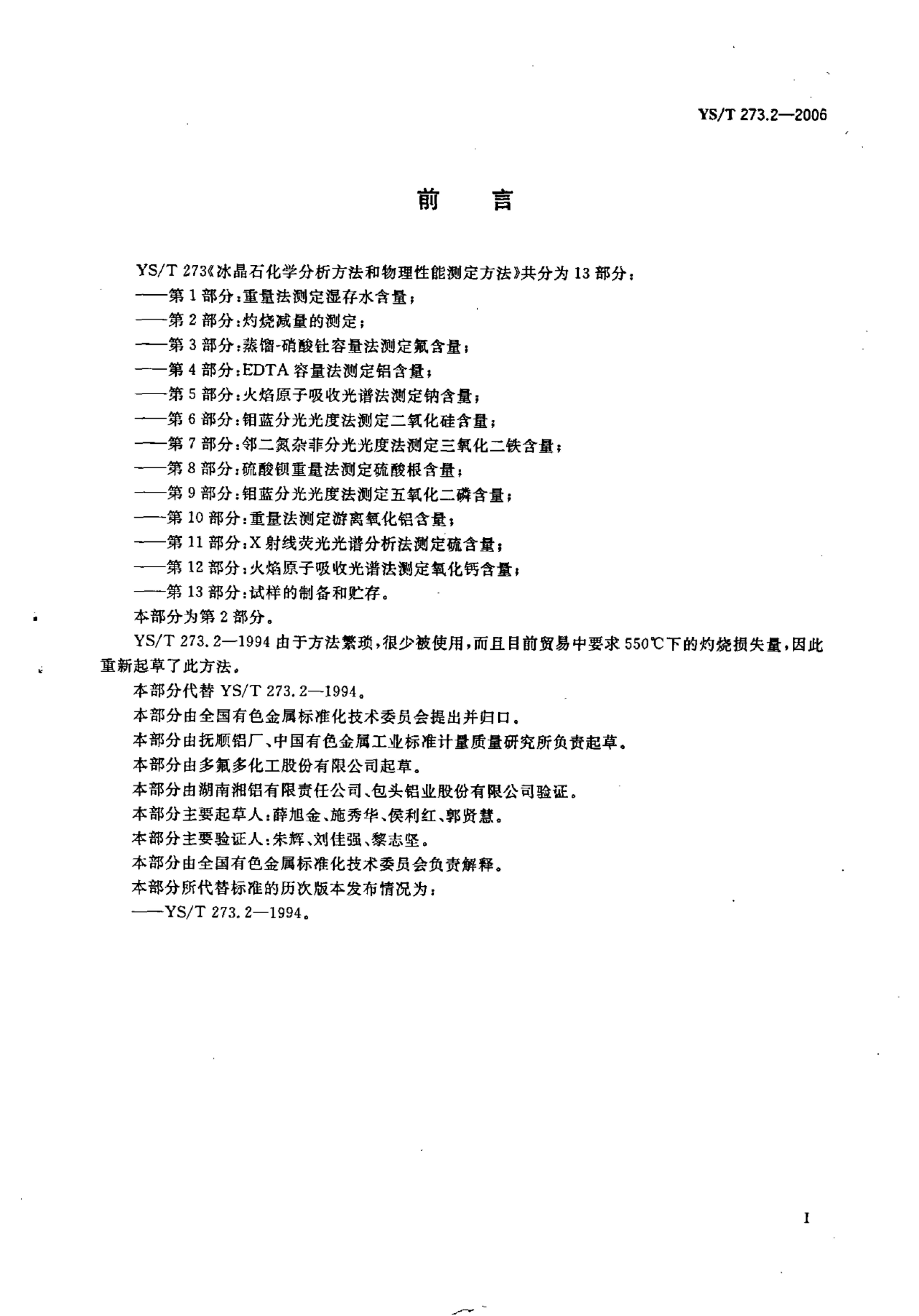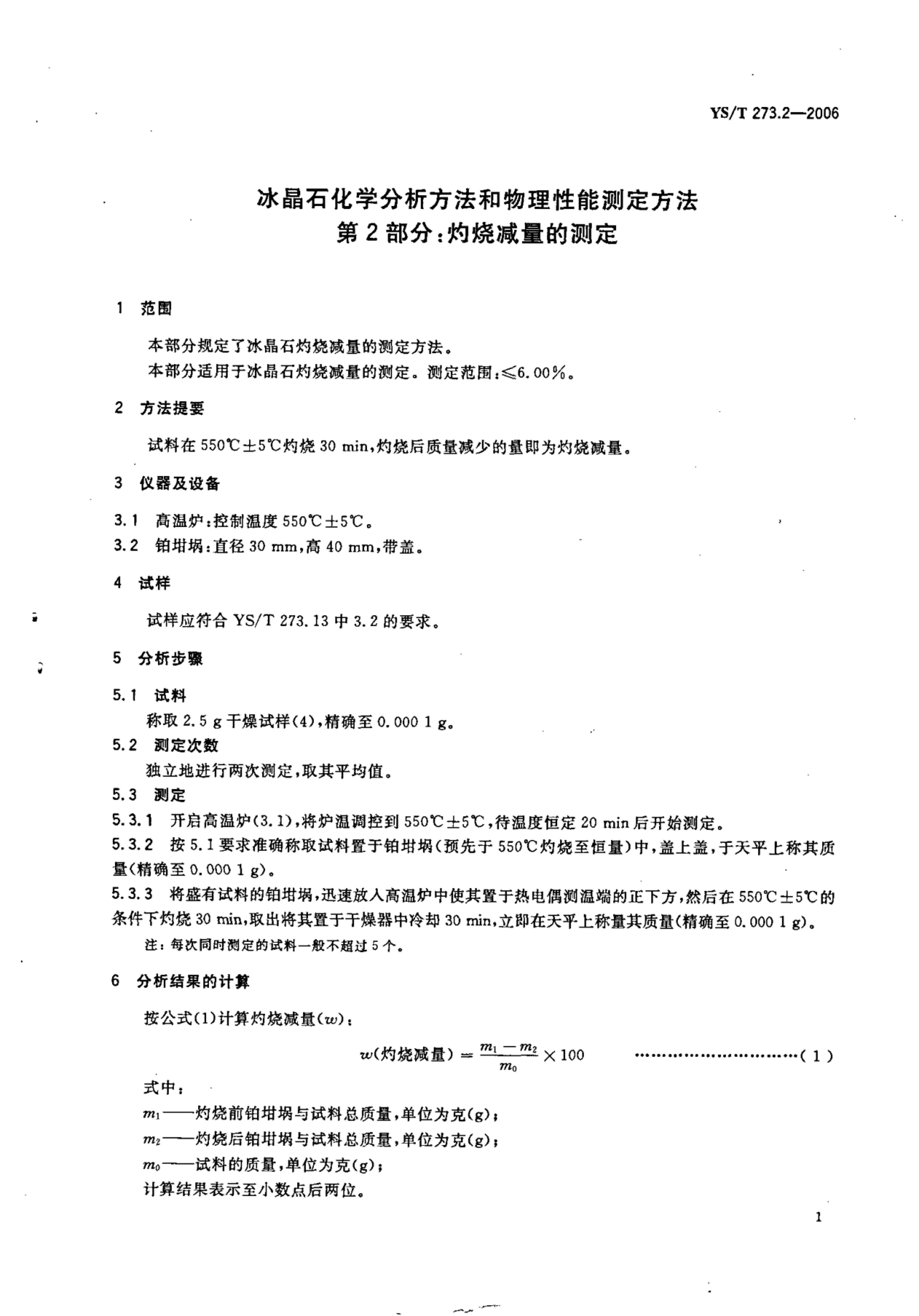 YS/T 273.2-2006 冰晶石化学分析方法和物理性能测定方法 第2部分:灼烧减量的测定