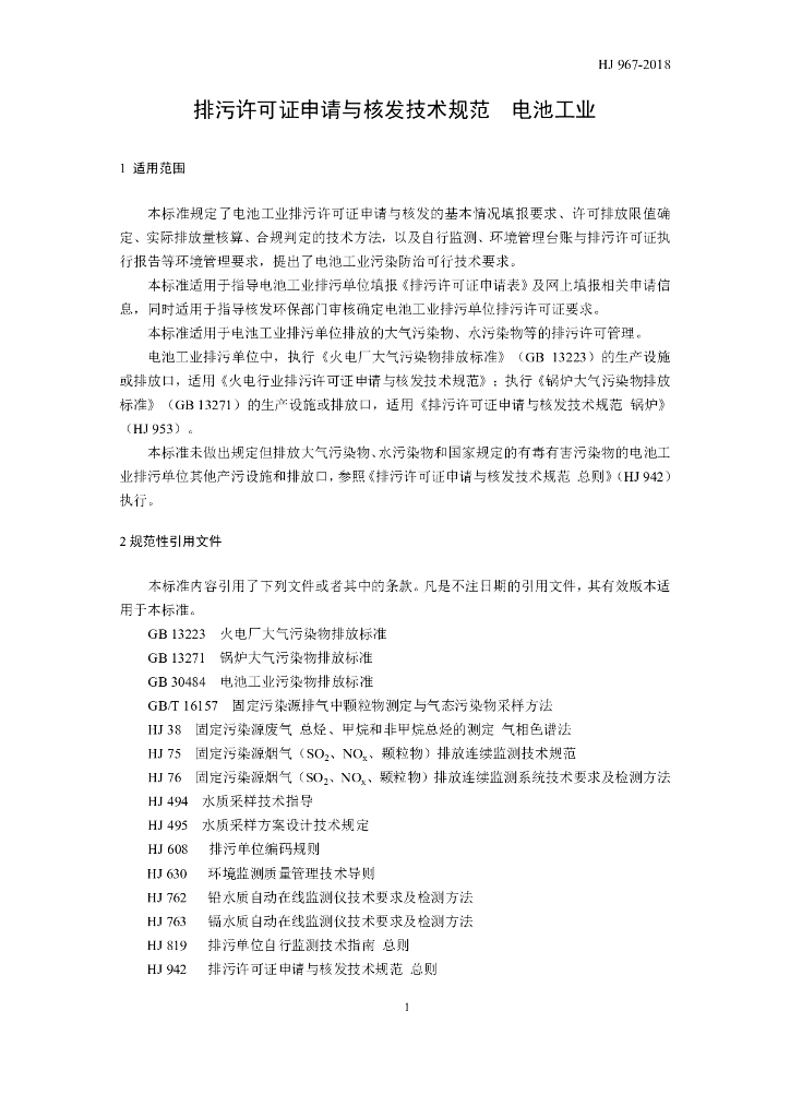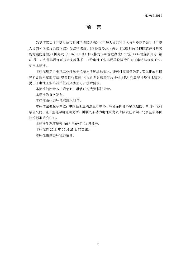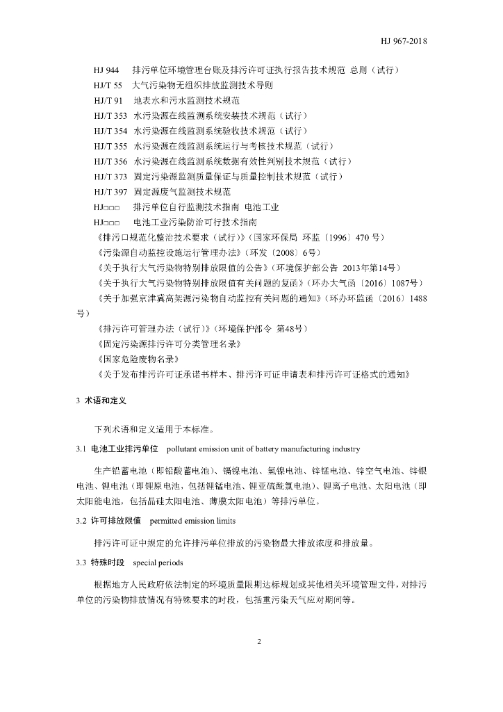 HJ 967-2018 排污许可证申请与核发技术规范电池工业