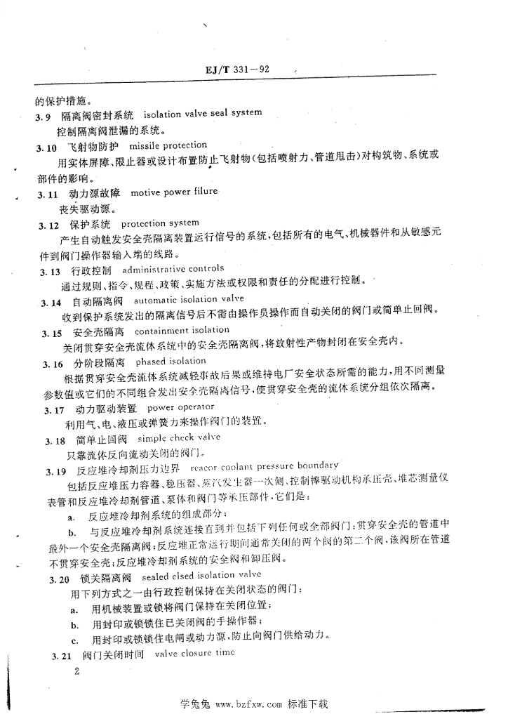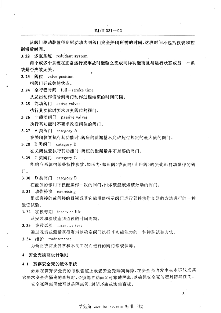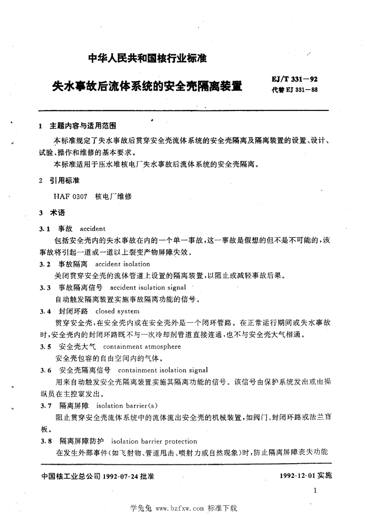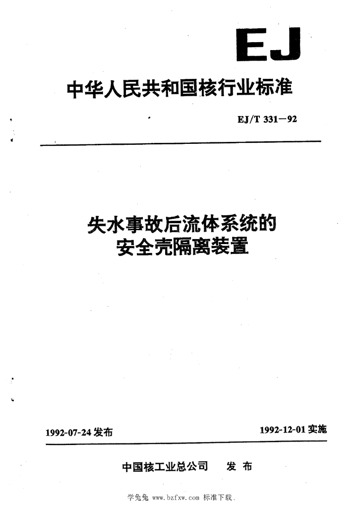 EJ/T 331-1992 失水事故后流体系统的安全壳隔离装置