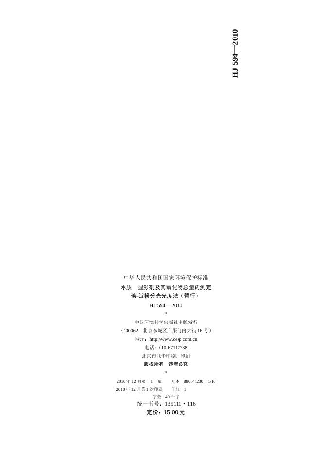 HJ 594-2010 水质 显影剂及其氧化物总量的测定 碘-淀粉分光光度法(暂行)