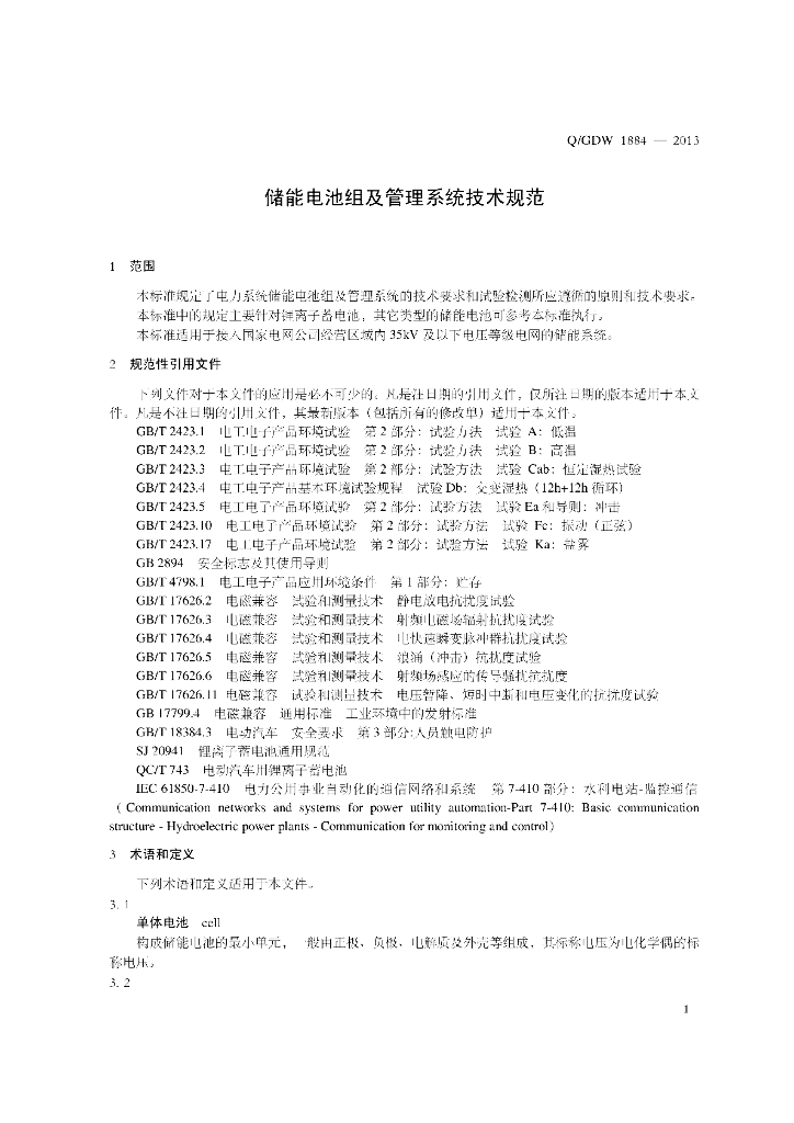 Q/GDW 1884-2013 储能电池组及管理系统技术规范