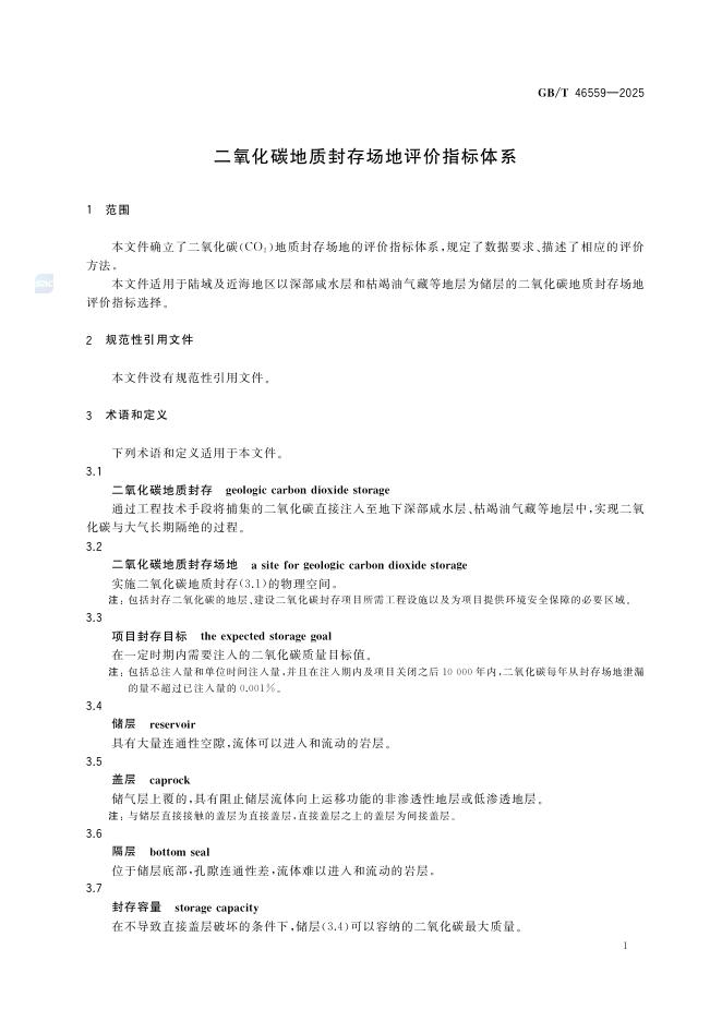 GB/T 46559-2025 二氧化碳地质封存场地评价指标体系