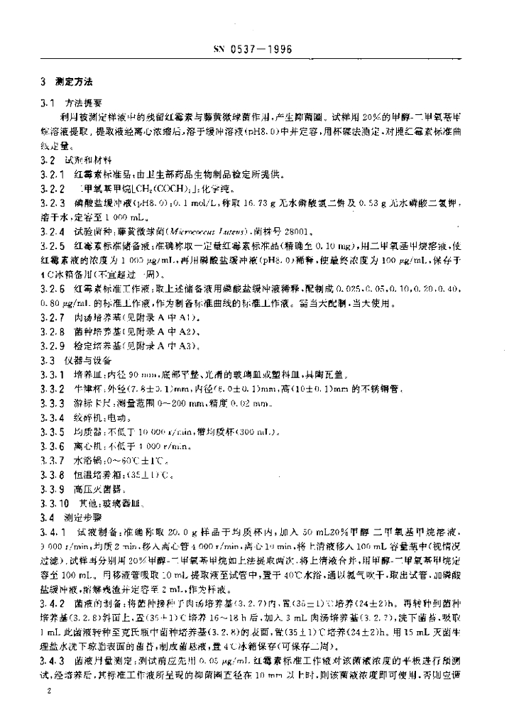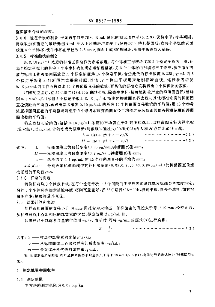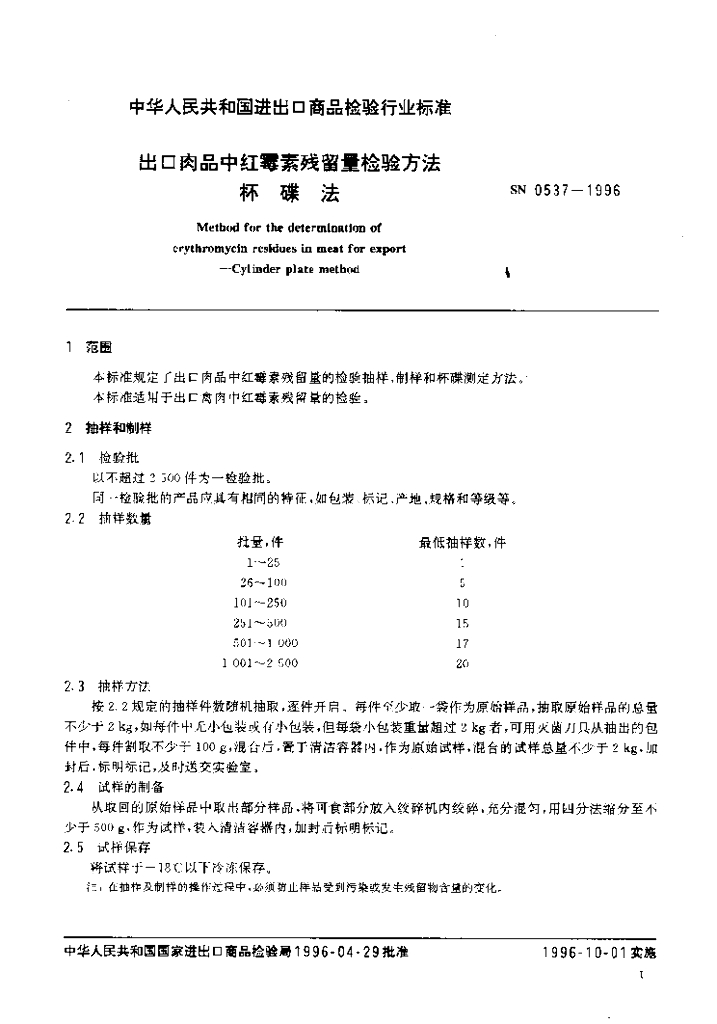 SN 0537-1996 出口肉品中红霉素残留量检验方法杯碟法