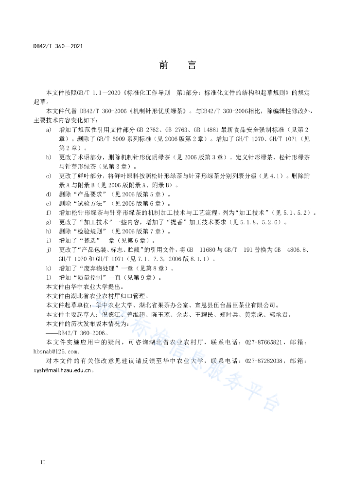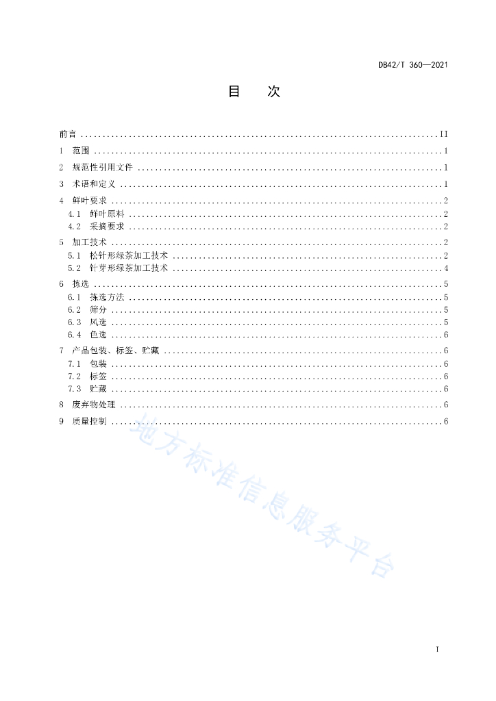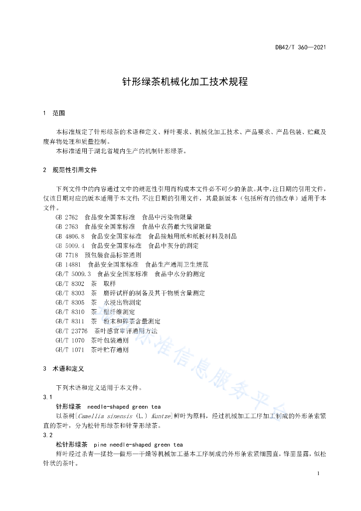 DB42/T 360-2021 针形绿茶机械化加工技术规程