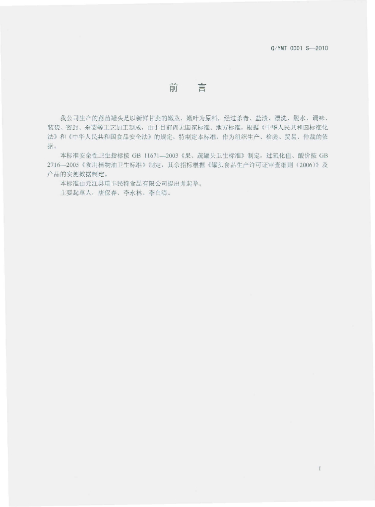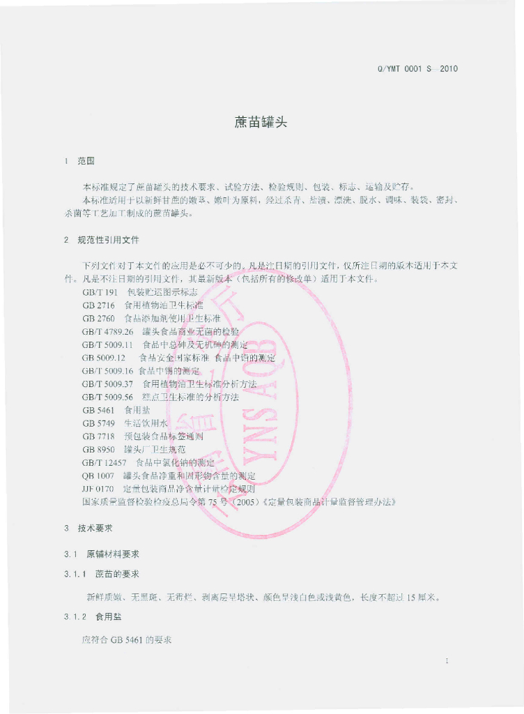 Q/YMT 0001S-2010 蔗苗罐头