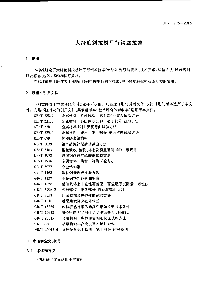 JT/T 775-2016 大跨度斜拉桥平行钢丝拉索