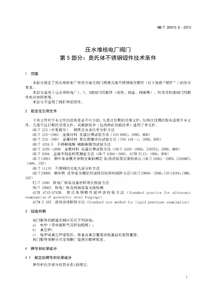 NB/T 20010.5-2010 压水堆核电厂阀门 第5部分:奥氏体不锈钢锻件技术条件