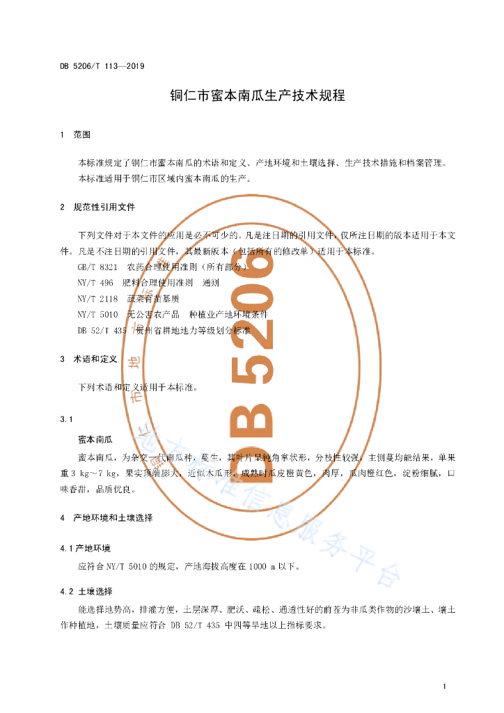 DB5206/T 113-2019 铜仁市蜜本南瓜生产技术规程