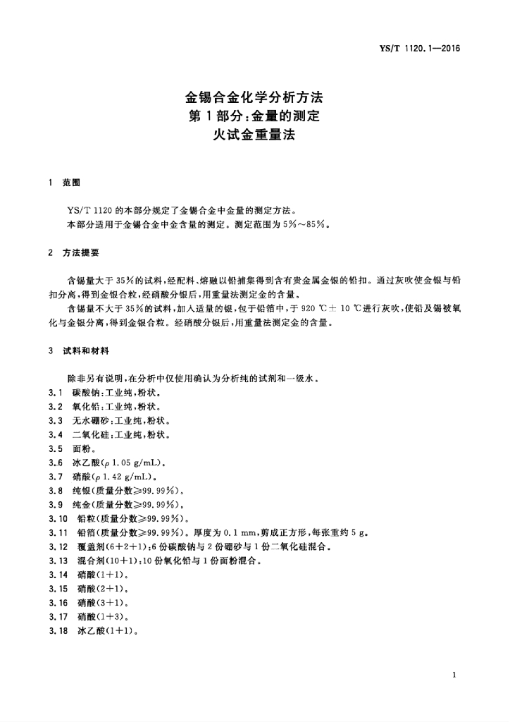 YS/T 1120.1-2016 金锡合金化学分析方法 第1部分:金量的测定 火试金重量法