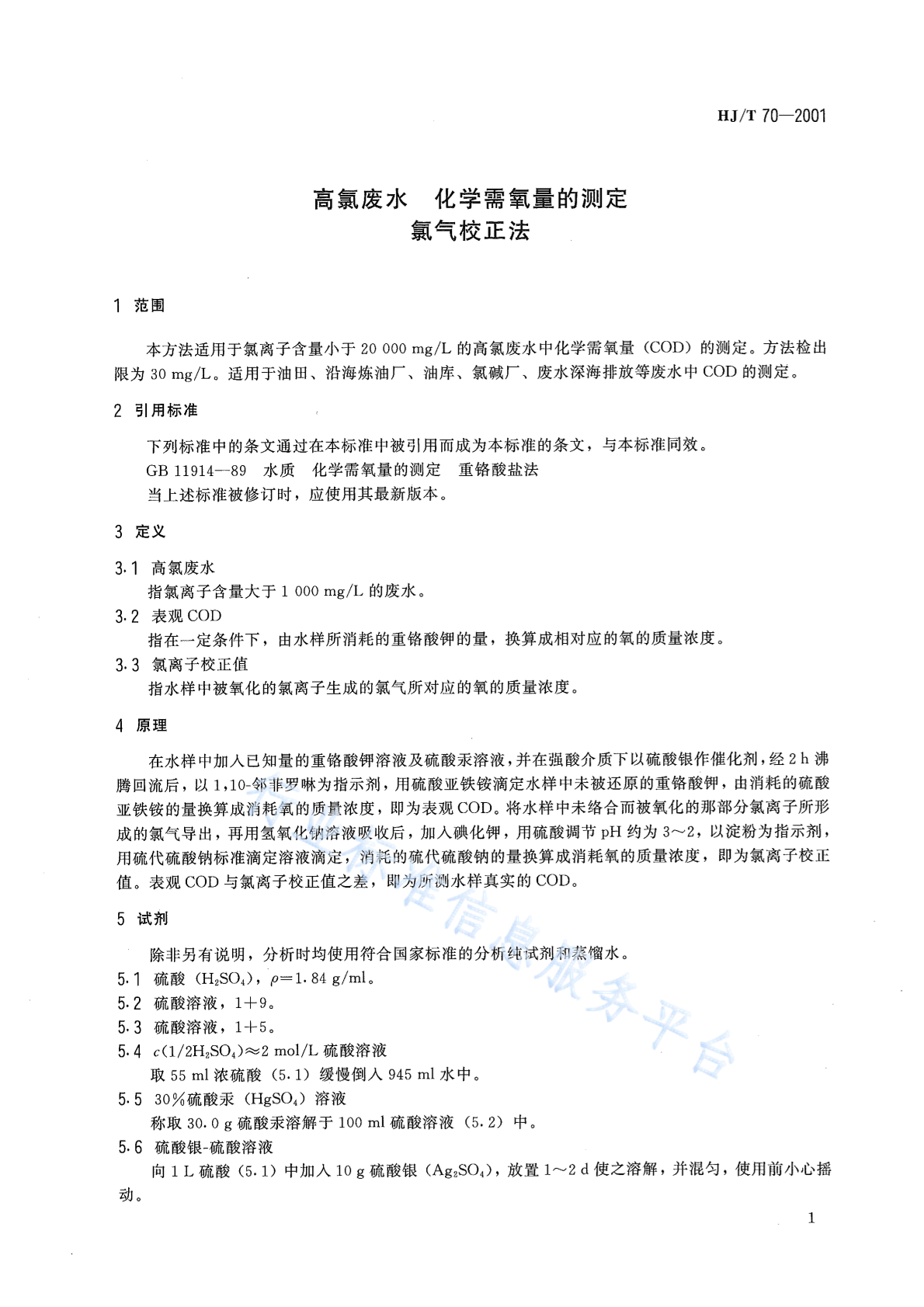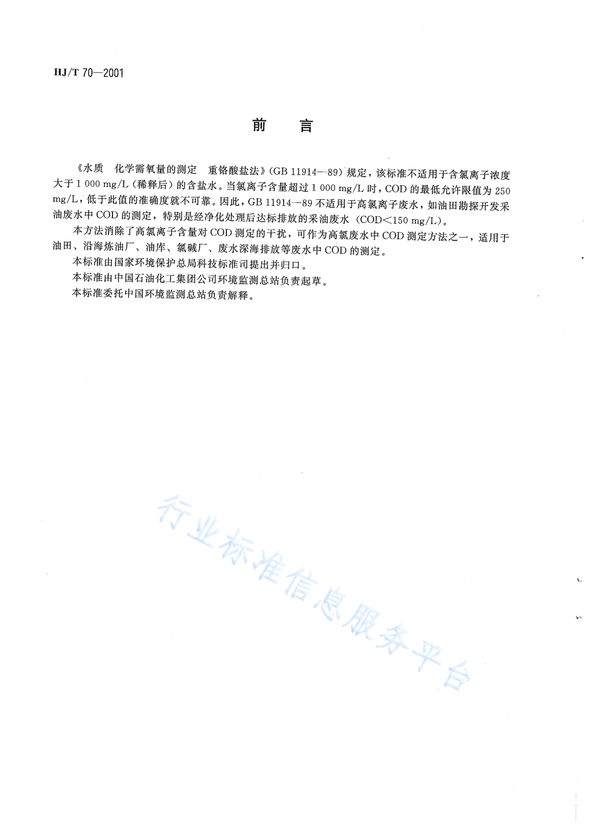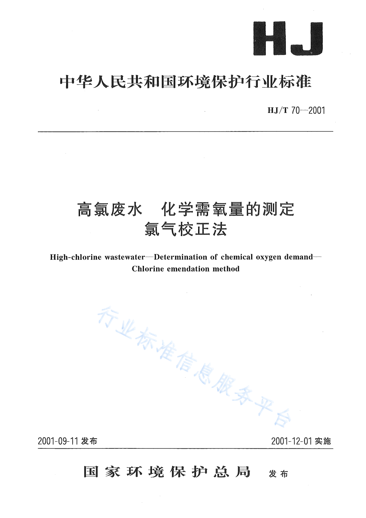 HJ/T 70-2001 高氯废水 化学需氧量的测定 氯气校正法