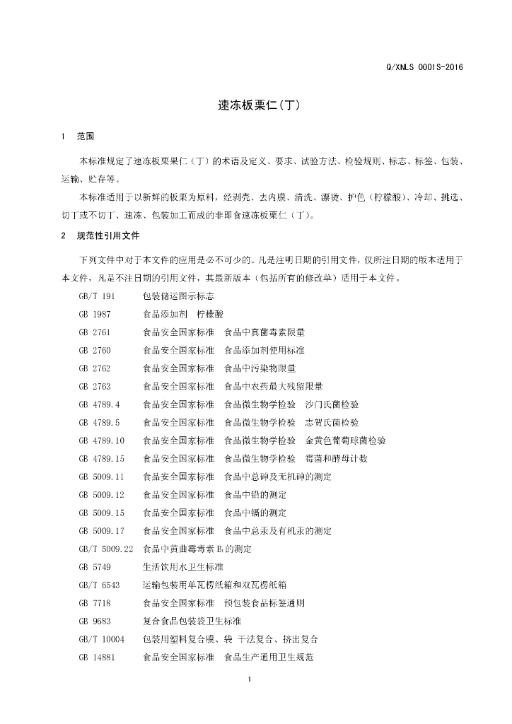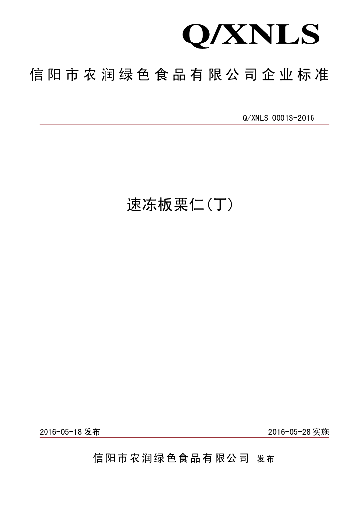 Q/XNLS 0001S-2016 信阳市农润绿色食品有限公司 速冻板栗仁(丁)