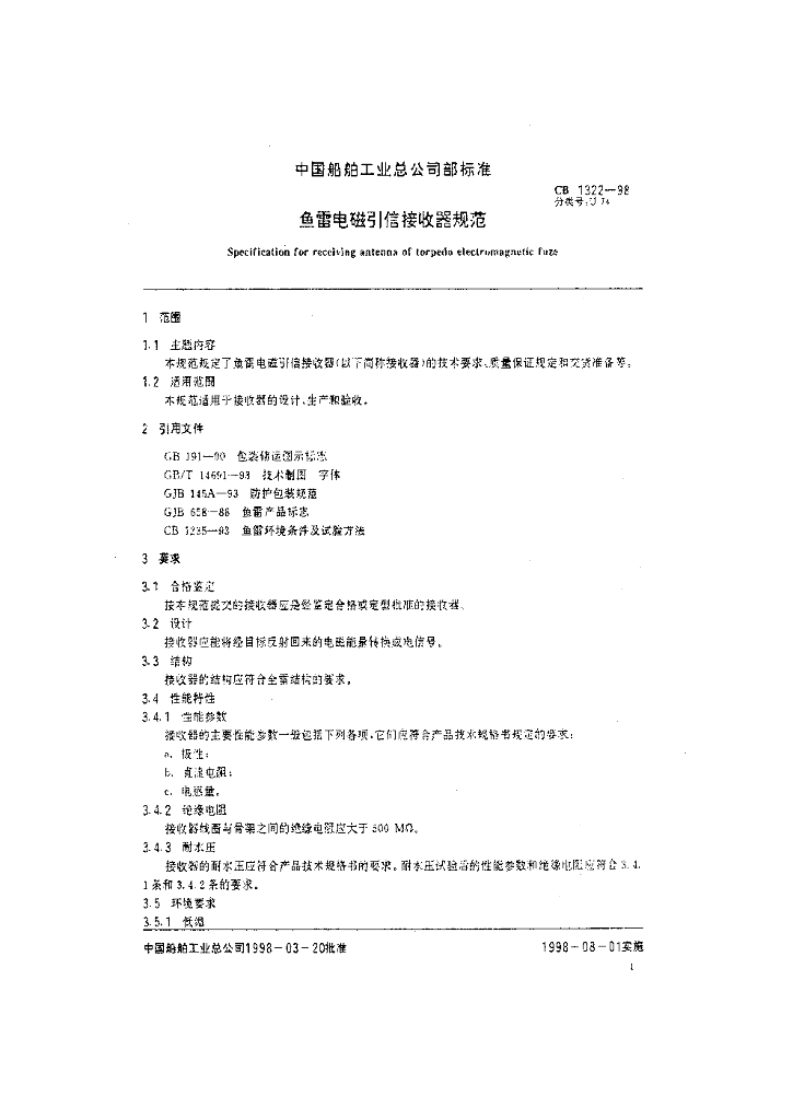 CB 1322-1998 鱼雷电磁引信接收器规范