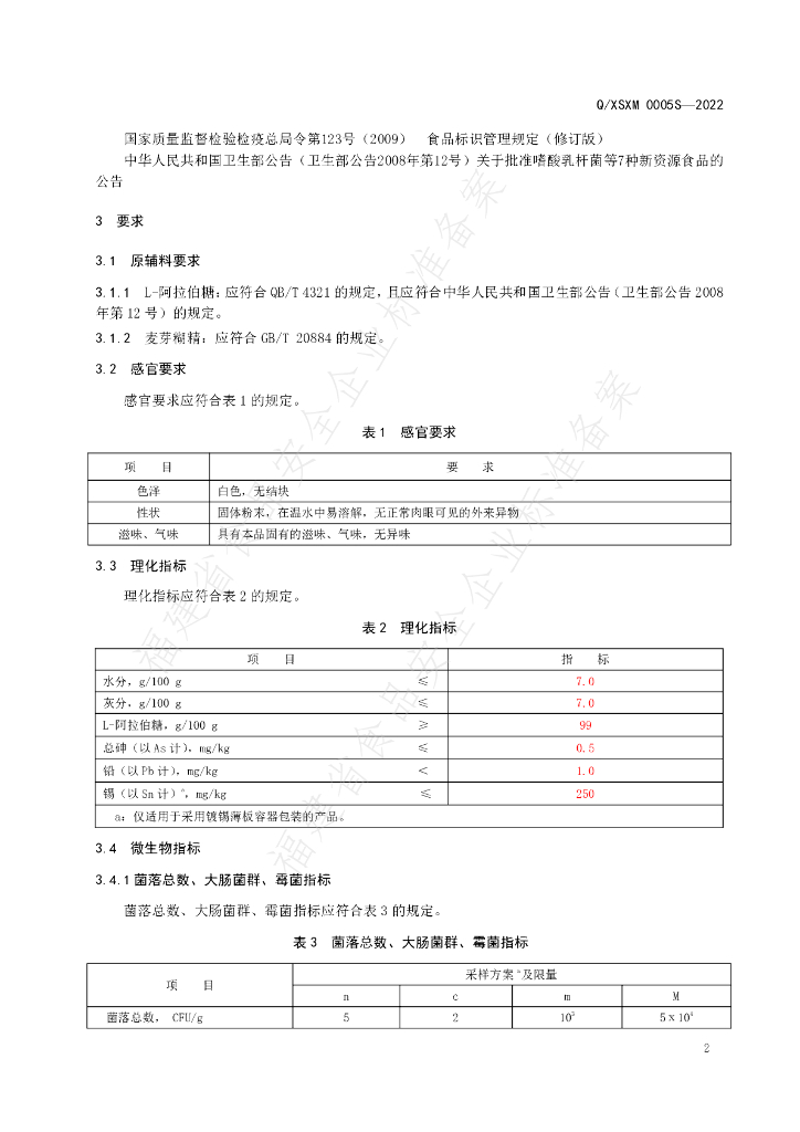 Q/XSXM 0005S-2022 L-阿拉伯糖固体饮料