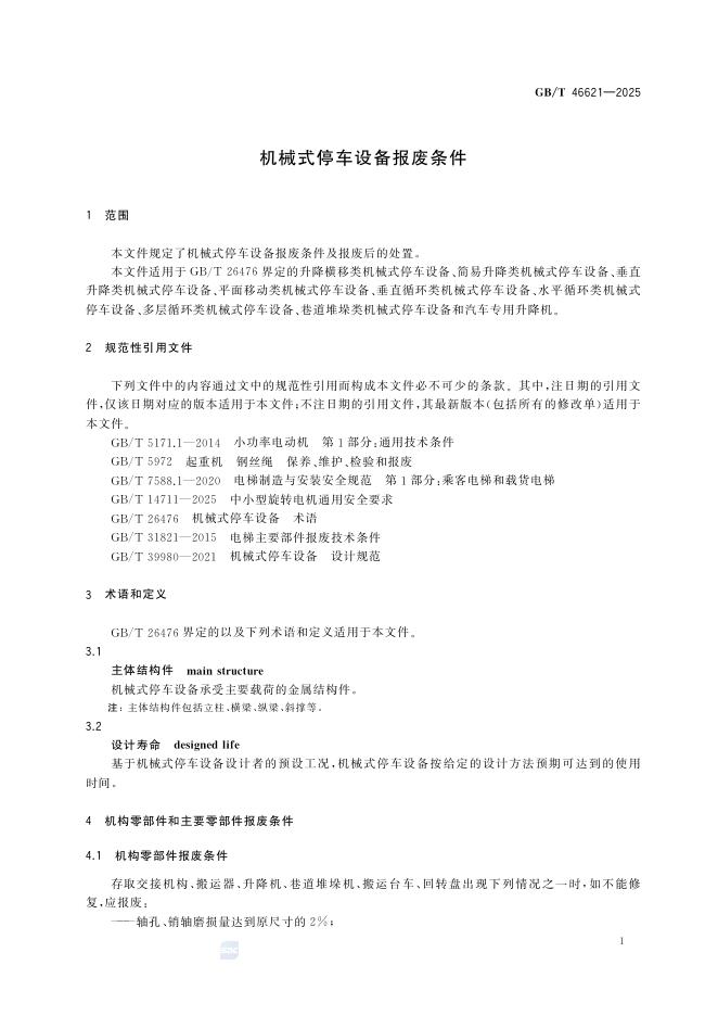 GB/T 46621-2025 机械式停车设备报废条件