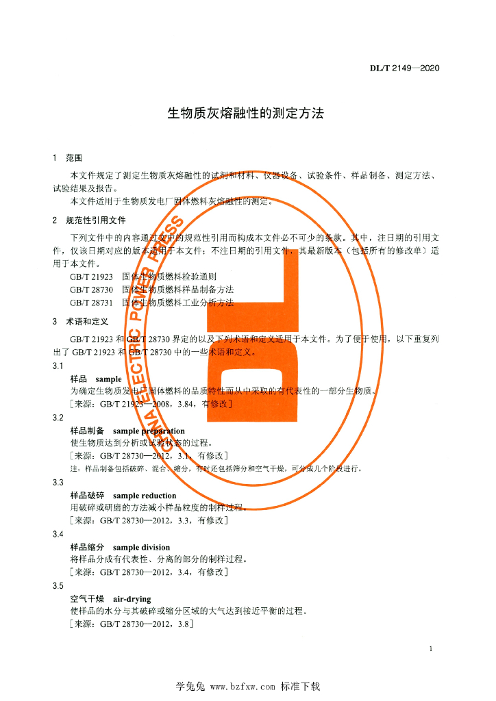 DL/T 2149-2020 生物质灰熔融性的测定方法