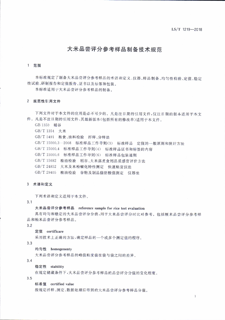 LS/T 1219-2018 大米品尝评分参考样品制备技术规范
