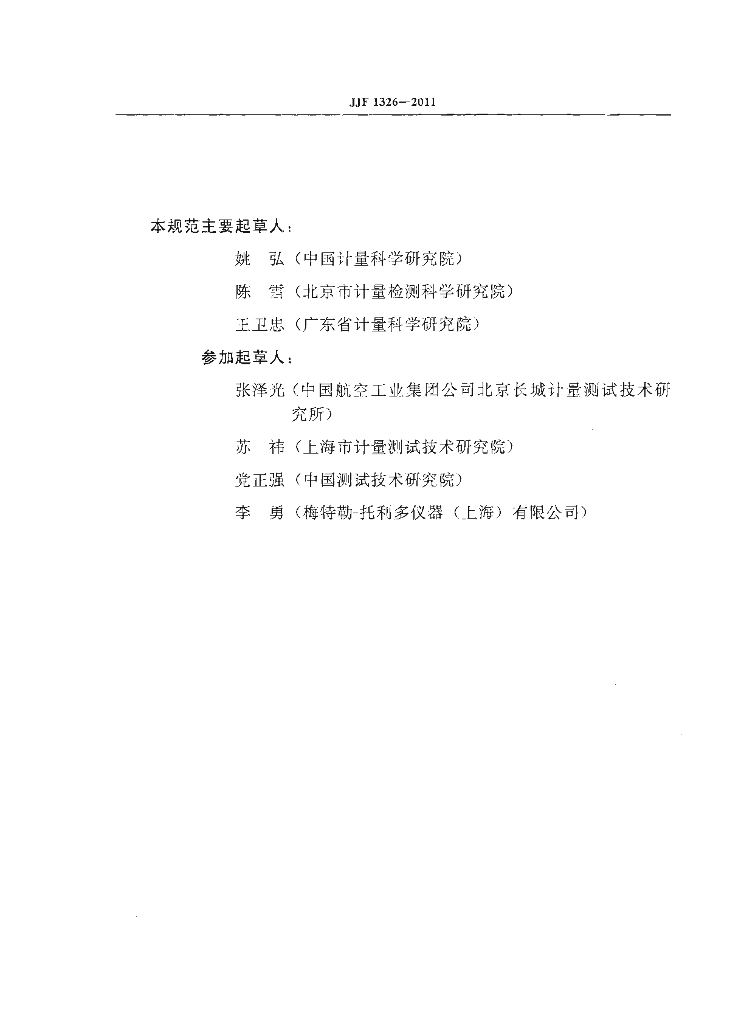 姚弘(中国计量科学研究院)、陈雪(北京市计量检测科学研究院)、王卫忠(广东省计量科学研究院)、张泽光(中国航空工业集团公司北京长城计量测试技术研究所)、苏伟(上海市计量测试技术研究院)、党正强(中国测试技术研究院)、李勇(梅特勒-托利多仪器(上海)有限公司)