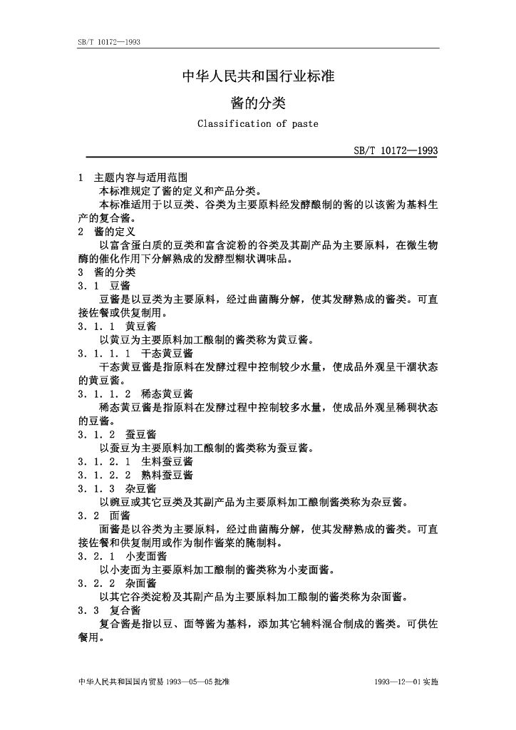 SB/T 10172-1993 酱的分类