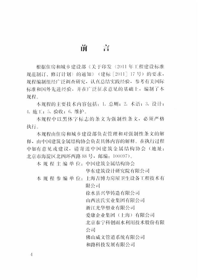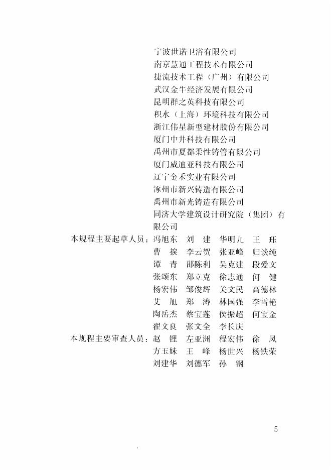中国建筑金属结构协会、华东建筑设计研究院有限公司、上海吉博力房屋卫生设备工程技术有限公司、徐水县兴华铸造有限公司、山西泫氏实业集团有限公司、浙江光华塑业有限公司、爱康企业集团(上海)有限公司、北京泰宁科创雨水利用技术股份有限公司、佛山威文管道系统有限公司、和路科技发展有限公司、宁波世诺卫浴有限公司、南京慧通工程技术有限公司、捷流技术工程(广州)有限公司、武汉金牛经济发展有限公司、昆明群之英科技有限公司、积水(上海)环境科技有限公司、浙江伟星新型建材股份有限公司、厦门中井科技有限公司、禹州市夏都柔性铸管有限