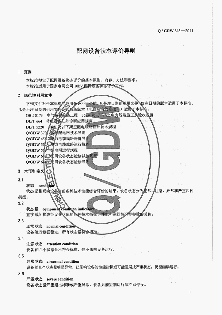 Q/GDW 645-2011 配网设备状态评价导则