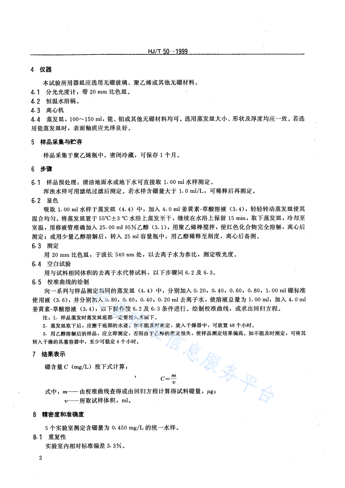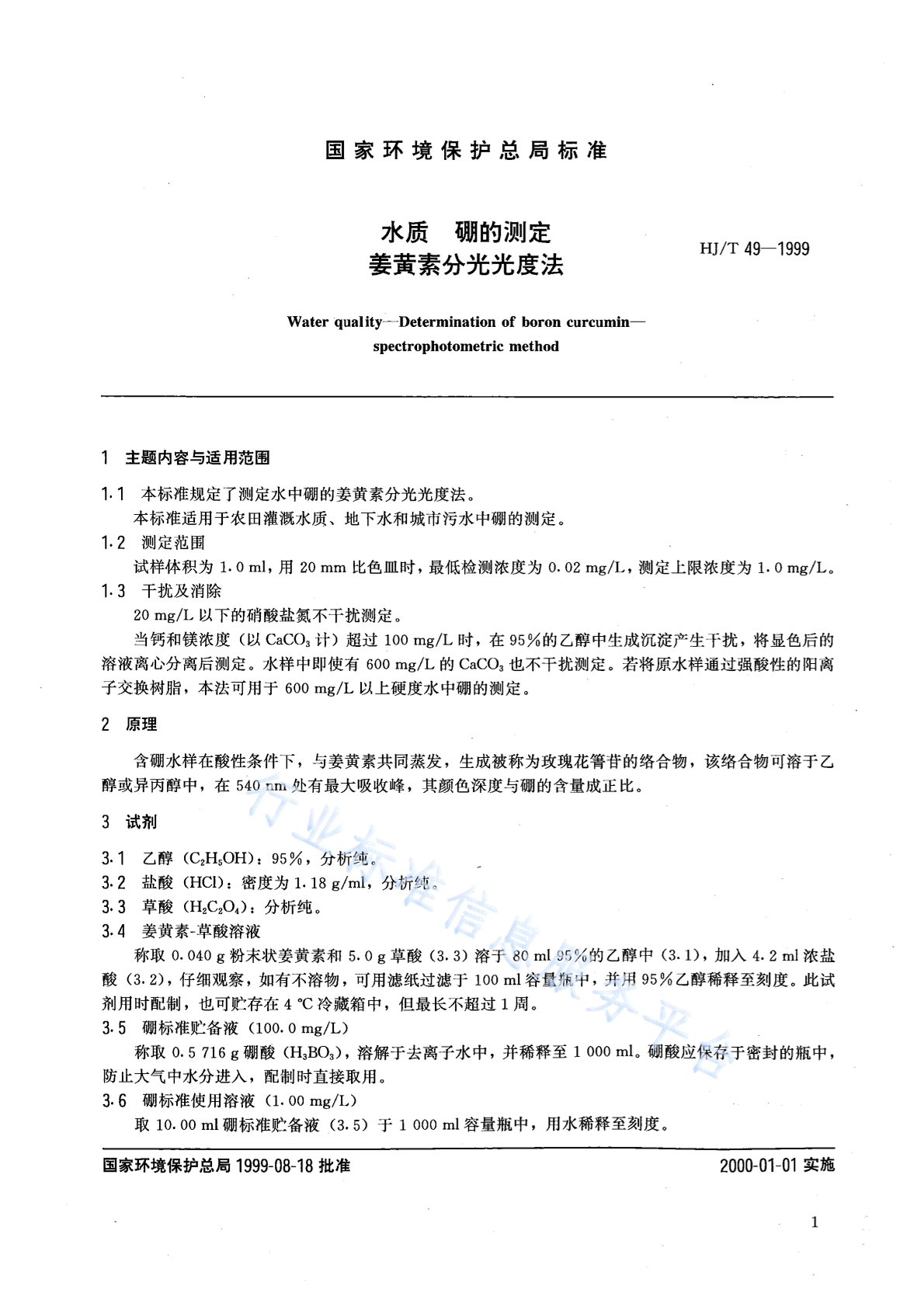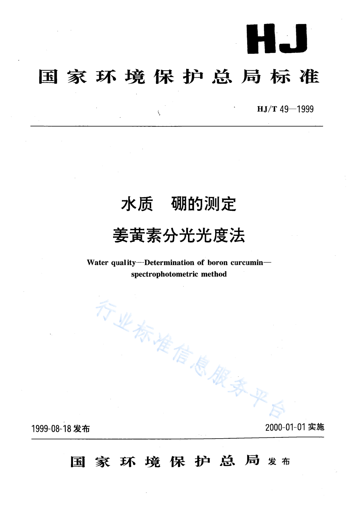 HJ/T 49-1999 水质 硼的测定 姜黄素分光光度法