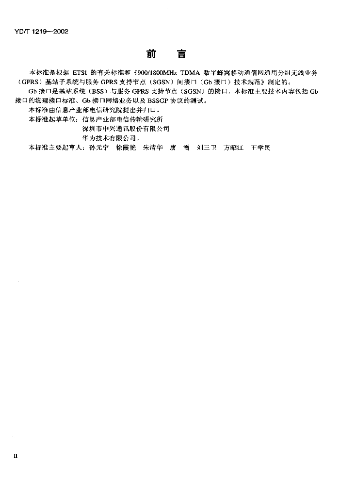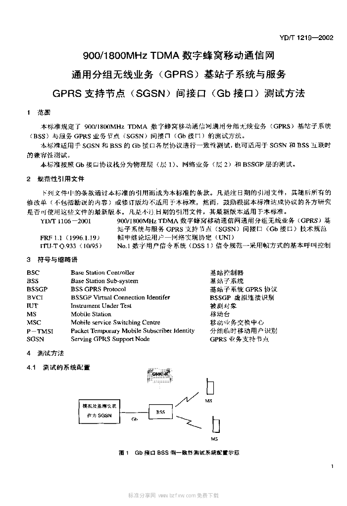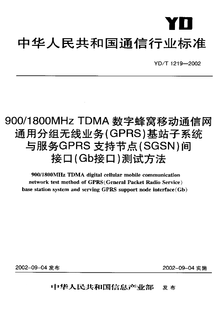 YD/T 1219-2002 900/1800MHz TDMA 数字蜂窝移动通信网通用分组无线业务(GPRS)基站子系统与服务GPRS支持节点(SGSN)间接口(Gb接口)测试方法