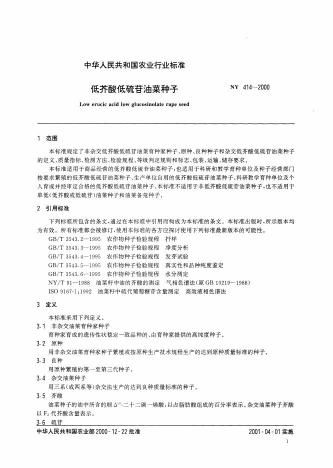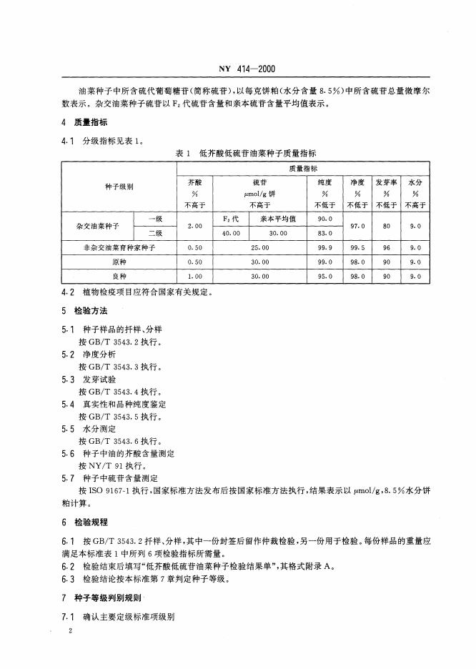 NY/T 414-2000 低芥酸低硫苷油菜种子