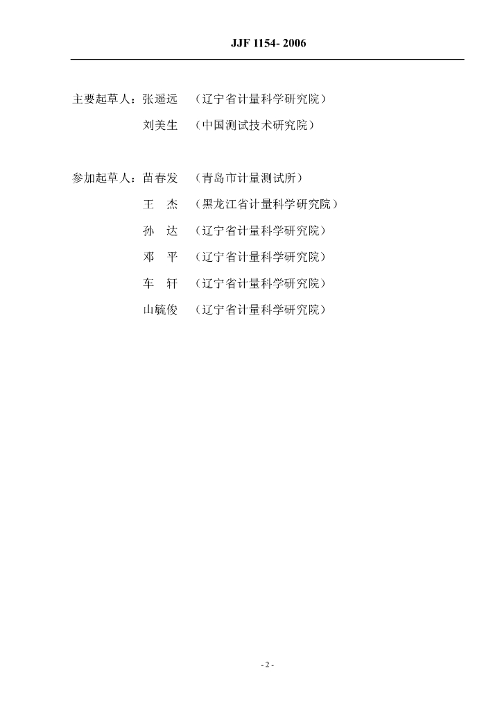 张遥远(辽宁省计量科学研究院)、刘美生(中国测试技术研究院)、苗春发(青岛市计量测试所)、王杰(黑龙江省计量科学研究院)、孙达(辽宁省计量科学研究院)、邓平(辽宁省计量科学研究院)、车轩(辽宁省计量科学研究院)、山毓俊(辽宁省计量科学研究院)
