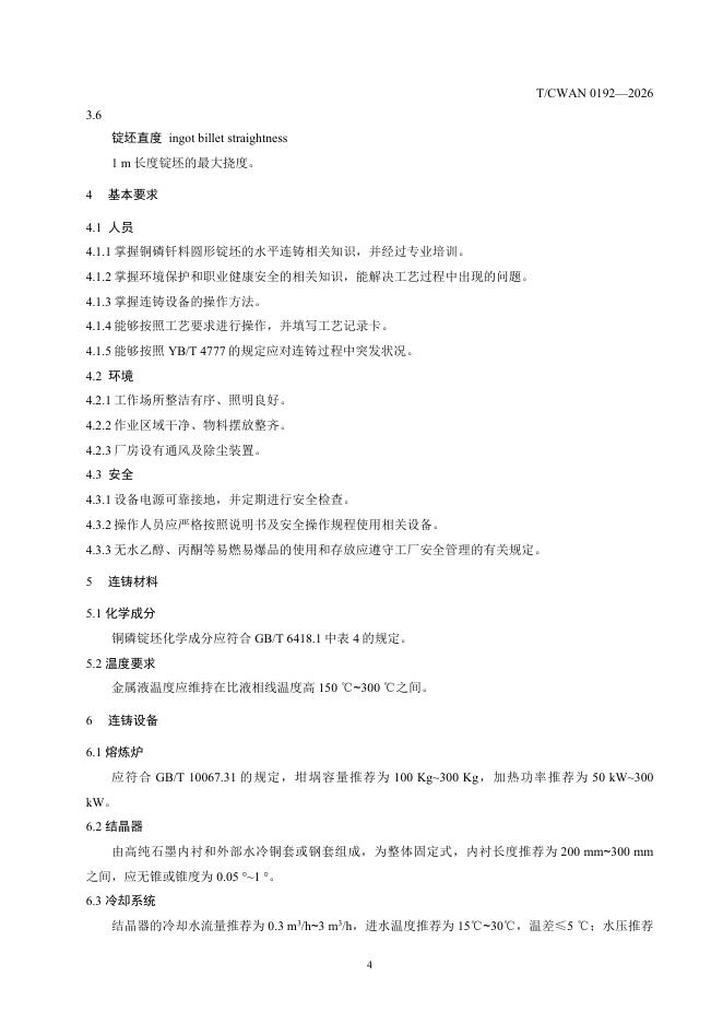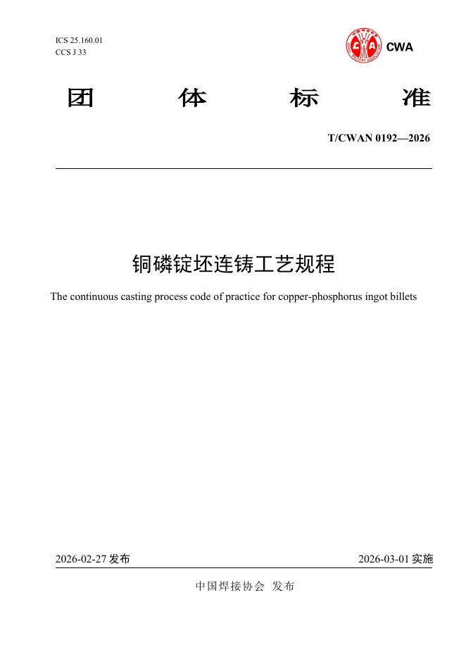 T/CWAN 0192-2026 铜磷锭坯连铸工艺规程