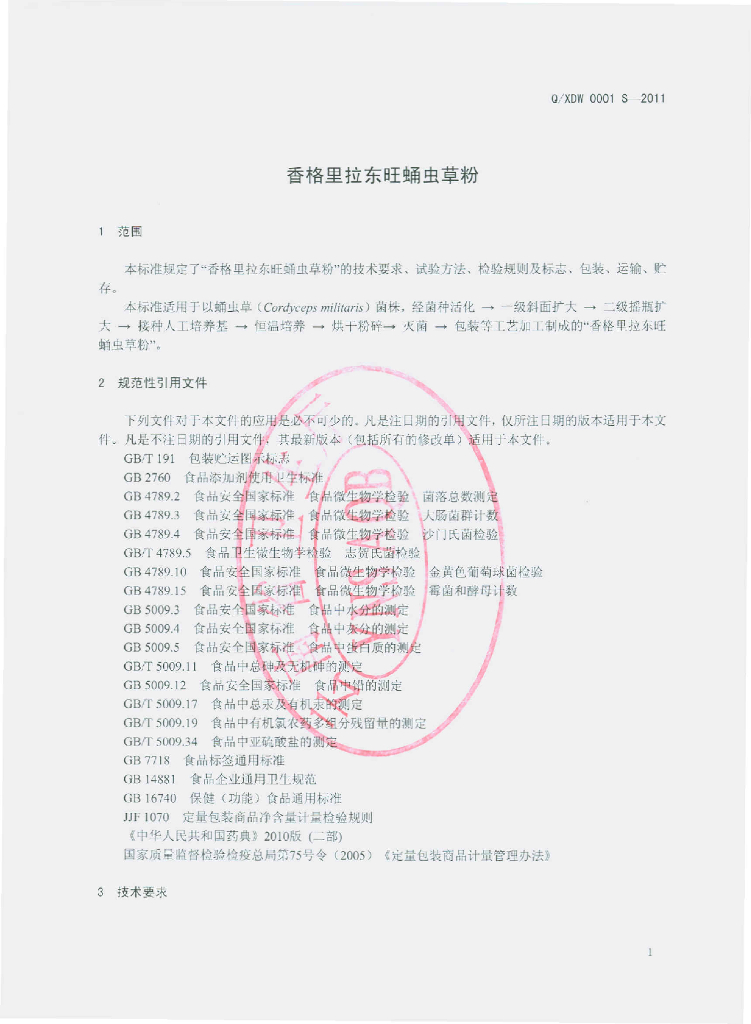 Q/XDW 0001S-2011 香格里拉东旺蛹虫草粉