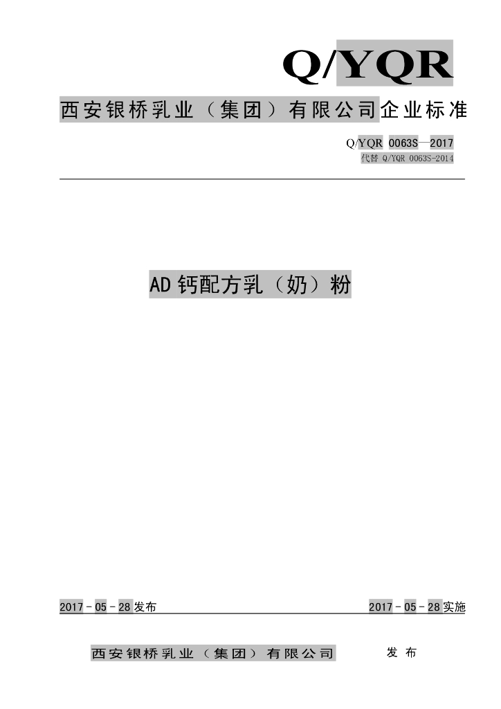 Q/YQR 0063S-2017 AD钙配方乳(奶)粉