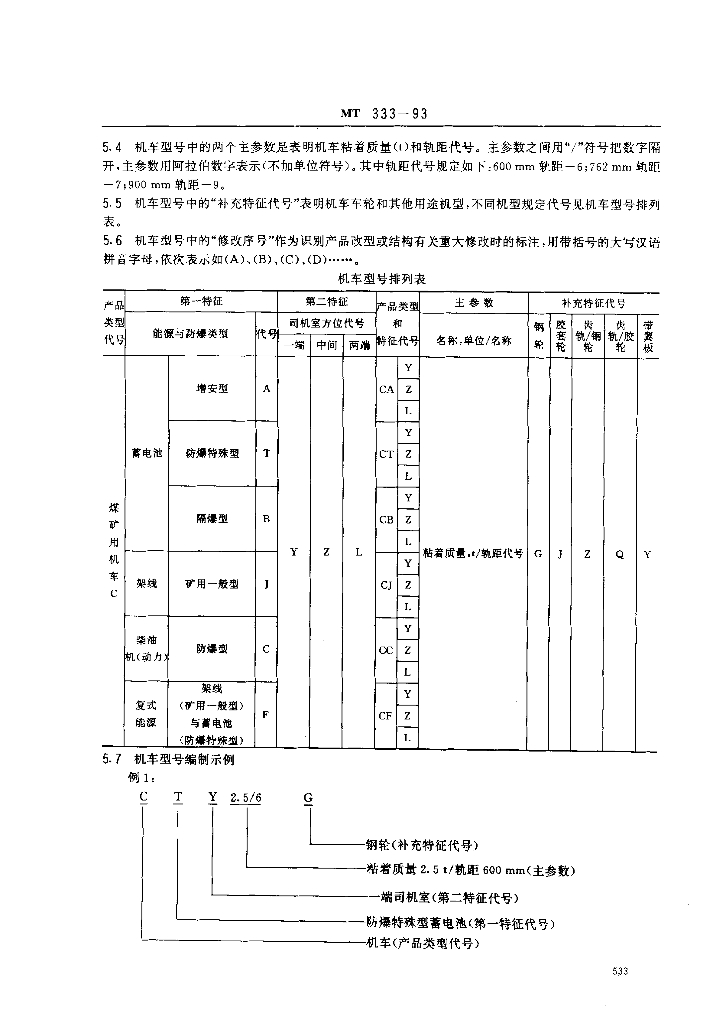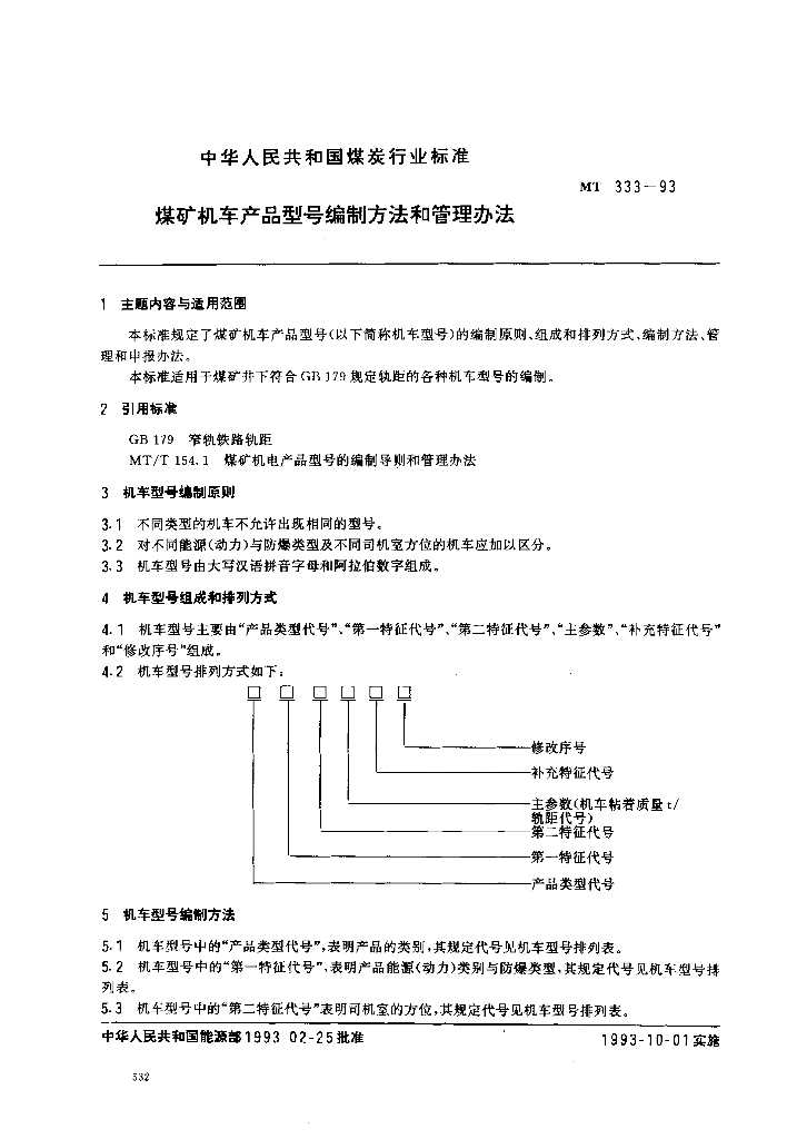 MT 333-1993 煤矿机车产品型号编制方法和管理办法